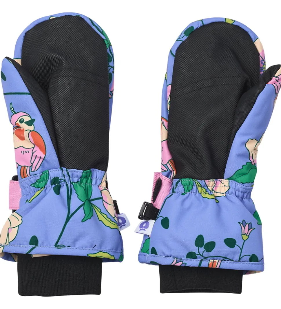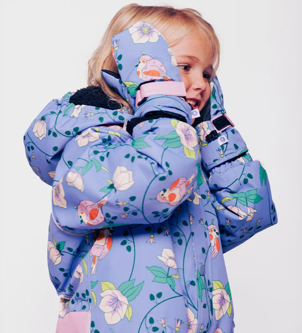 Lune Småfolk luffer i en smuk lilla nuance med et charmerende blomsterprint og farverige fugle.