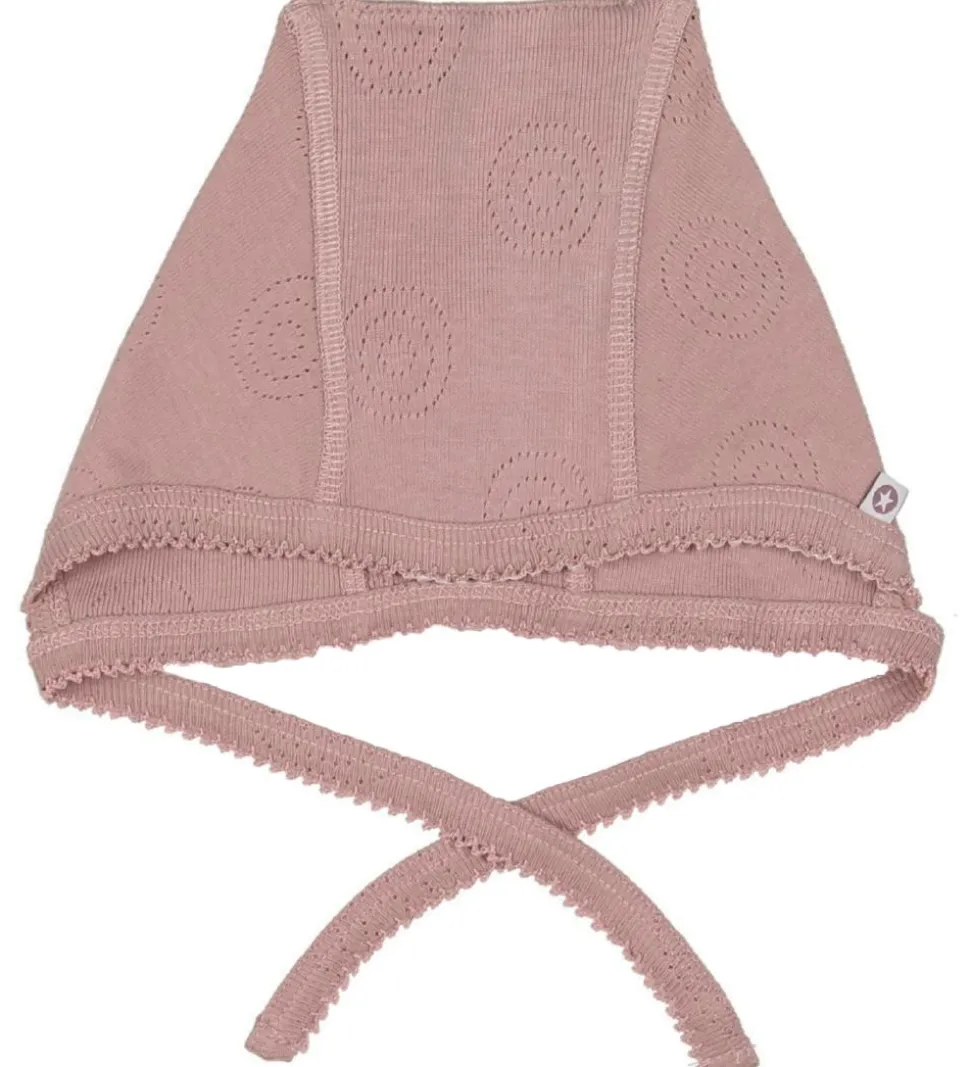 Sød Smallstuff babyhjelm i pudder med et flot hulmønster med cirkler og søde blondekanter.