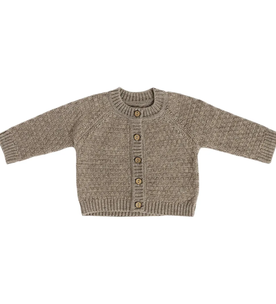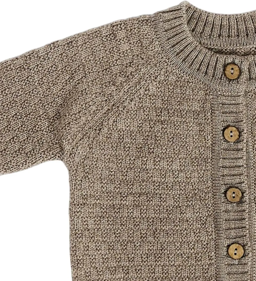 Charmerende cardigan fra Smallstuff i ensfarvet beige. Cardiganen præsenterer en elegant ribstruktur ved halsen, ærmerne og nederst. Knaplukningen i fronten understreger et klassisk design, og de fine knapper tilfører et subtilt touch. Smallstuff cardiganen har en behagelig pasform med lange ærmer, der giver et tidløst udtryk. Cardiganen er lavet i en strikket kvalitet af blødt merinould.