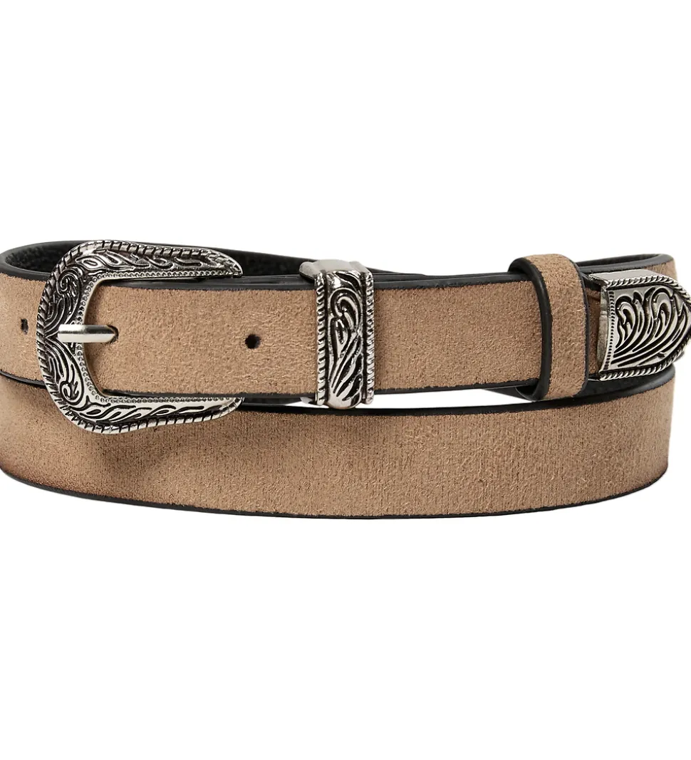 Elegant Sofie Schnoor bælte i en beige imiteret ruskind med flot dekorerede bæltespænder i sølvfarvet metal.