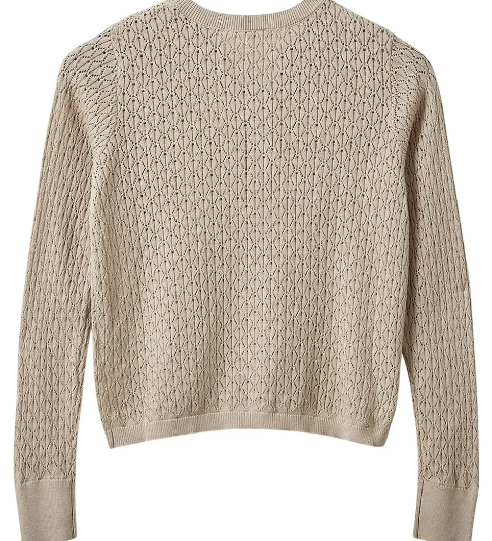 Elegant Sofie Schnoor cardigan i en neutral beige farve med en fin hulmønsterstruktur. Denne Sofie Schnoor model har knaplukning foran og lange ærmer, der afsluttes med ribkanter. Den runde halsudskæring og pasformen gør cardiganen anvendelig til forskellige anledninger. Detaljerne giver et stilrent udtryk.