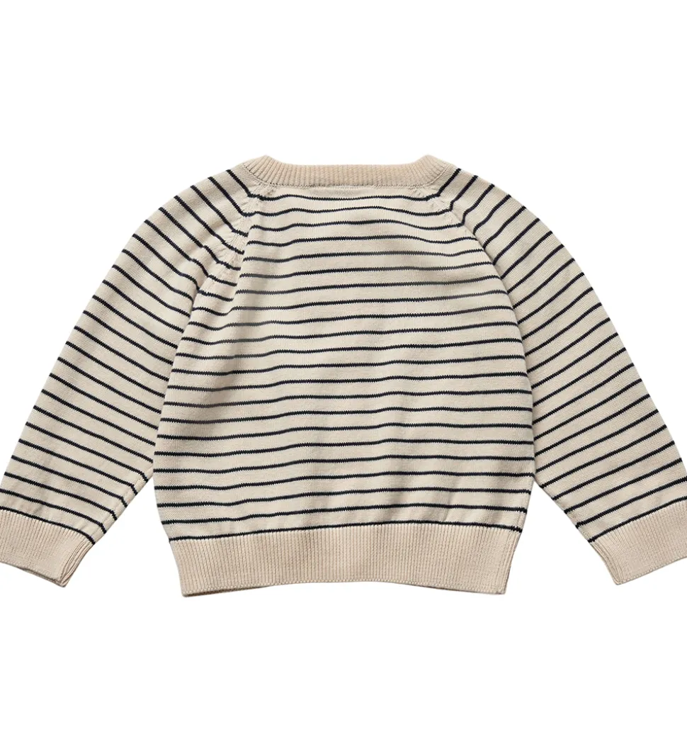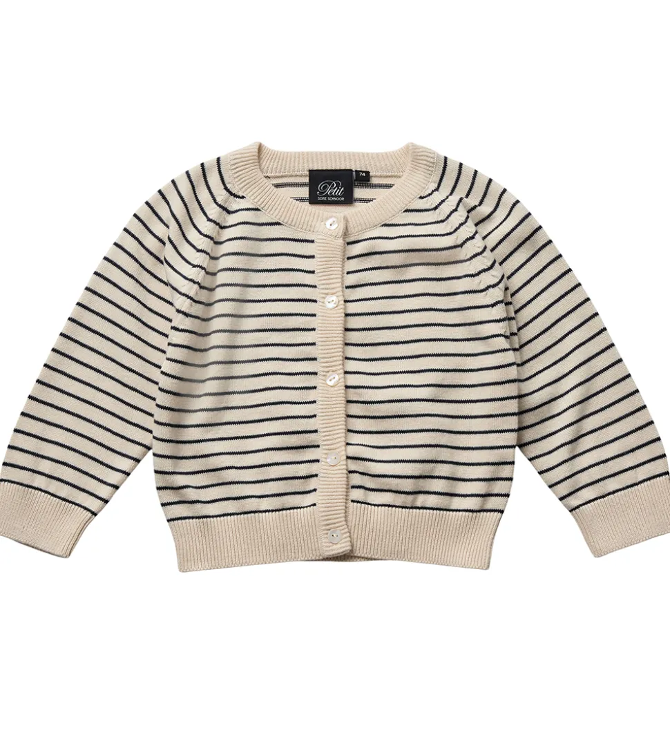 Smart Sofie Schnoor cardigan i råhvid strik, med smalle, vandrette striber i navy.