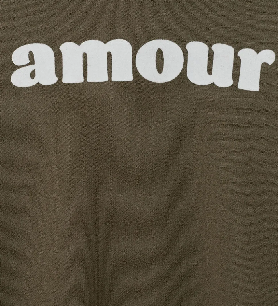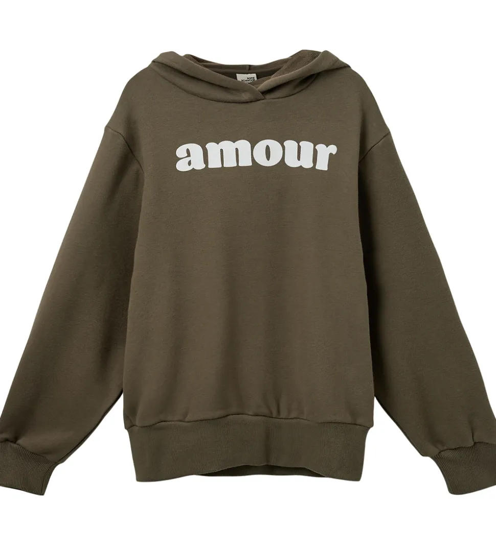 Lækker Sofie Schnoor hættetrøje i en stilren, olivengrøn nuance. Hættetrøjen har et markant, hvidt print af ordet “amour” på fronten. Sofie Schnoor hættetrøjen er designet med brede ribkanter ved ærmerne og kanten forneden, hvilket giver en klassisk pasform.
