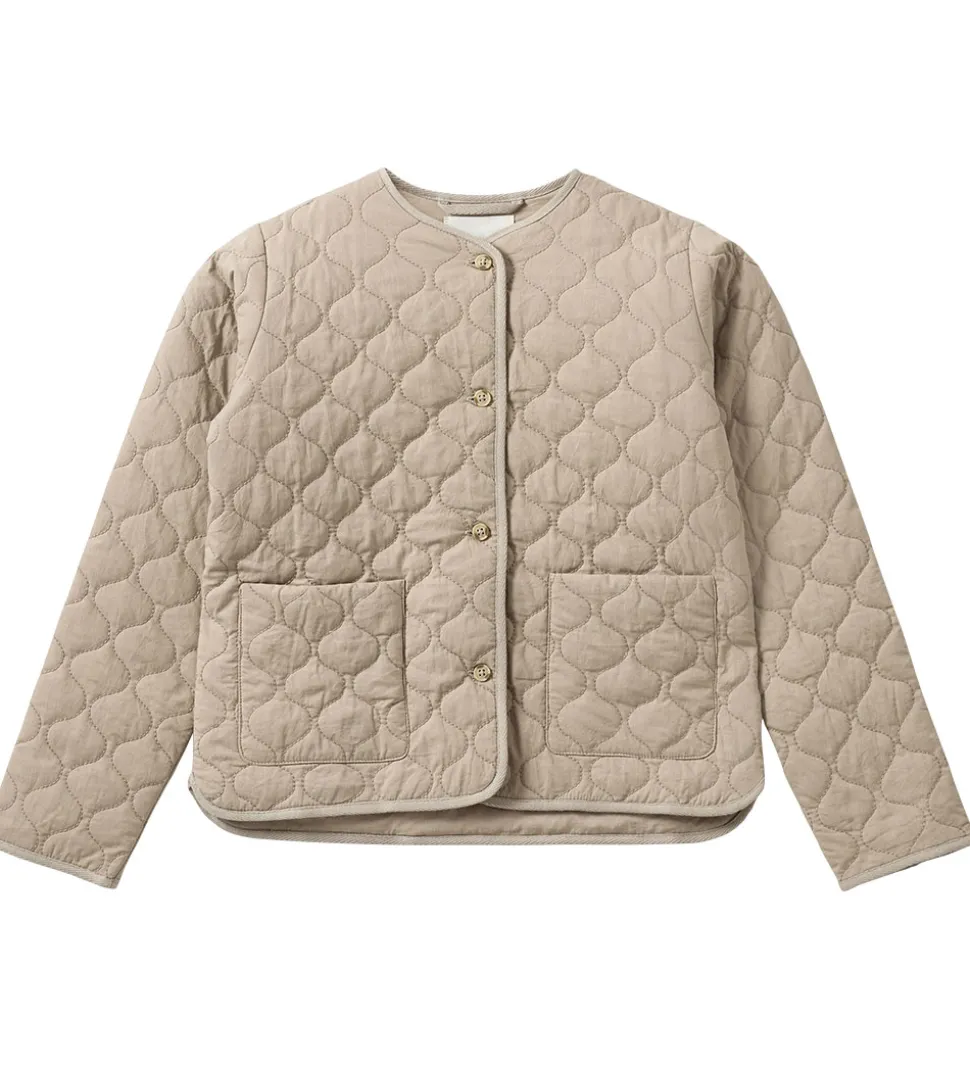 Lækker Sofie Schnoor jakke i en beige nuance med quiltet design og praktiske lommer. Den har lange ærmer og knaplukning, hvilket giver et stilrent look. Jakken har en let vattering.