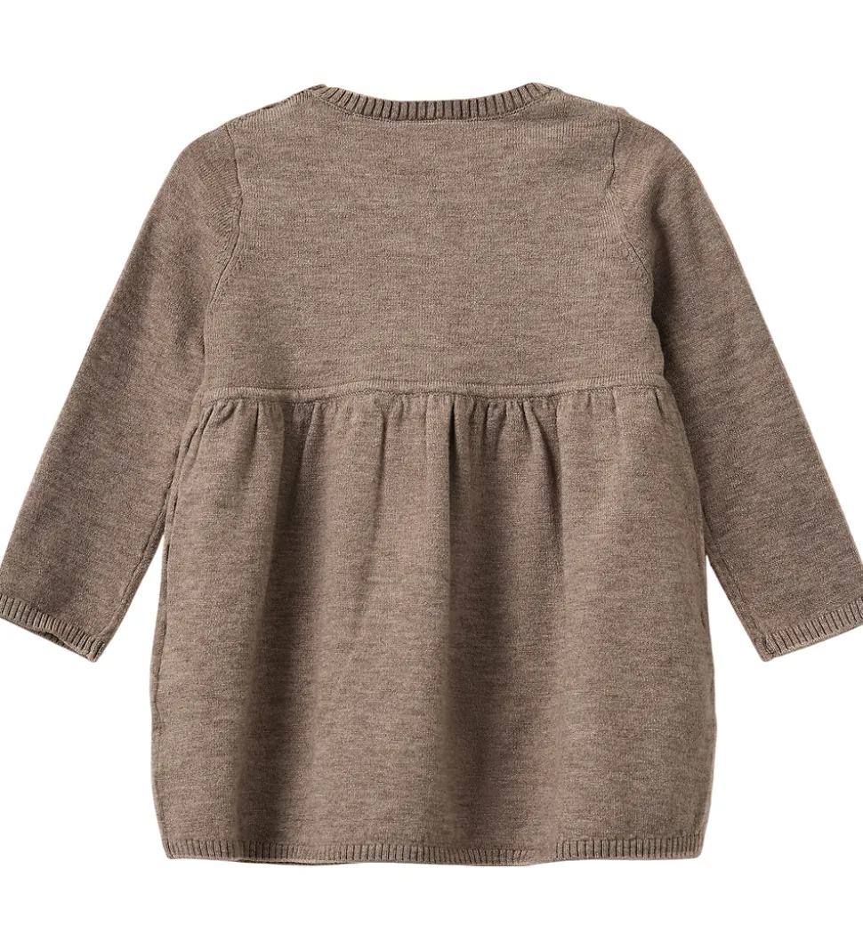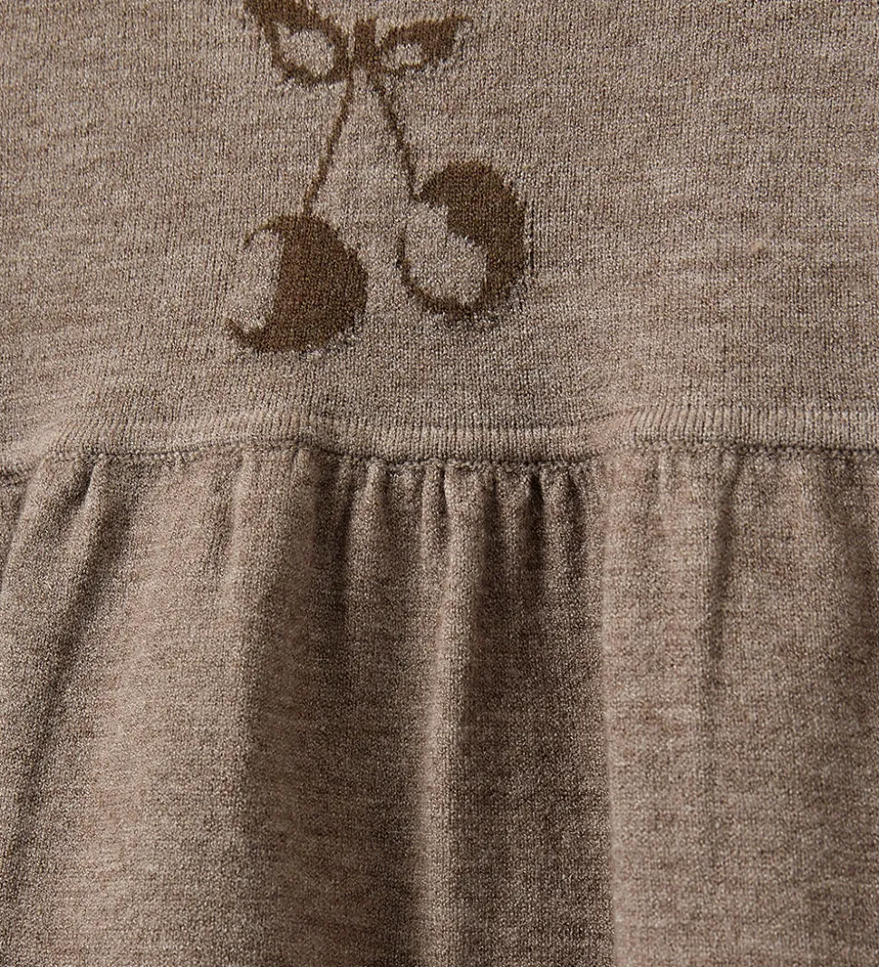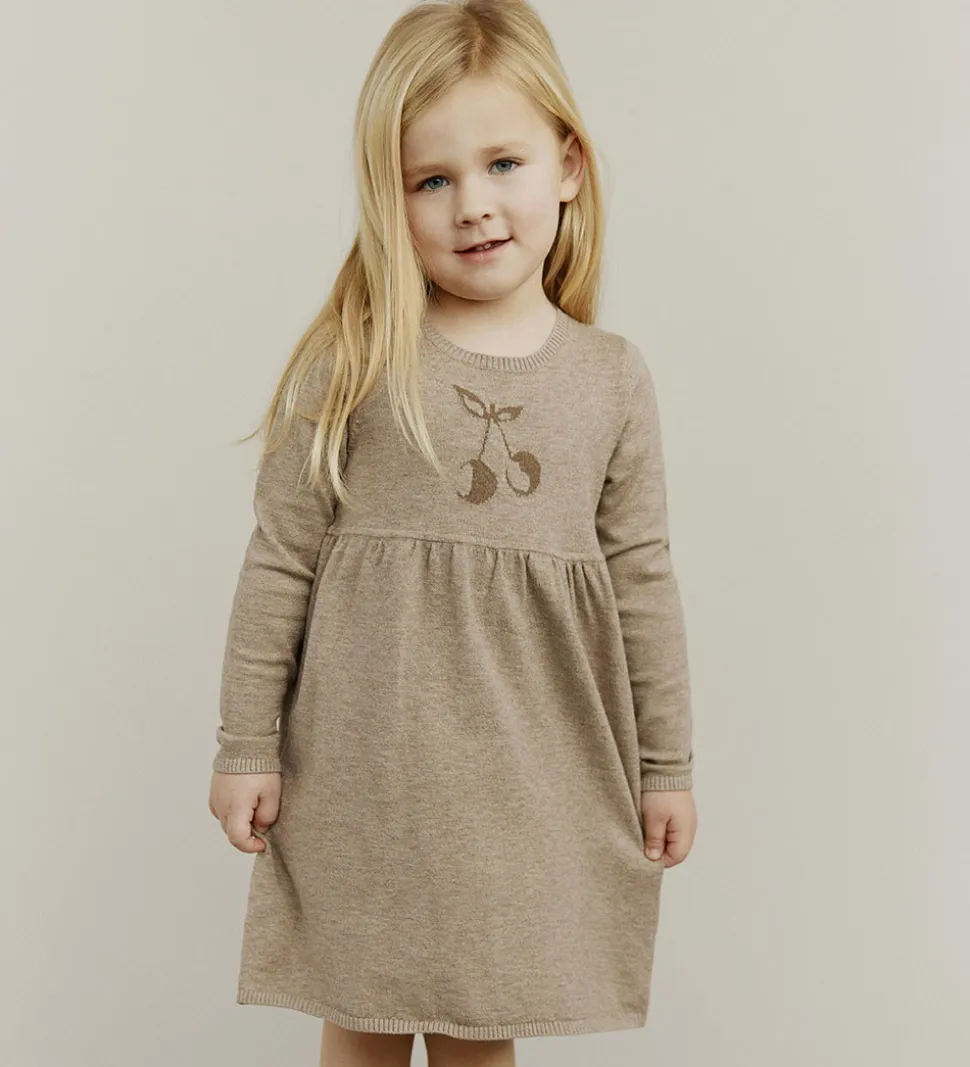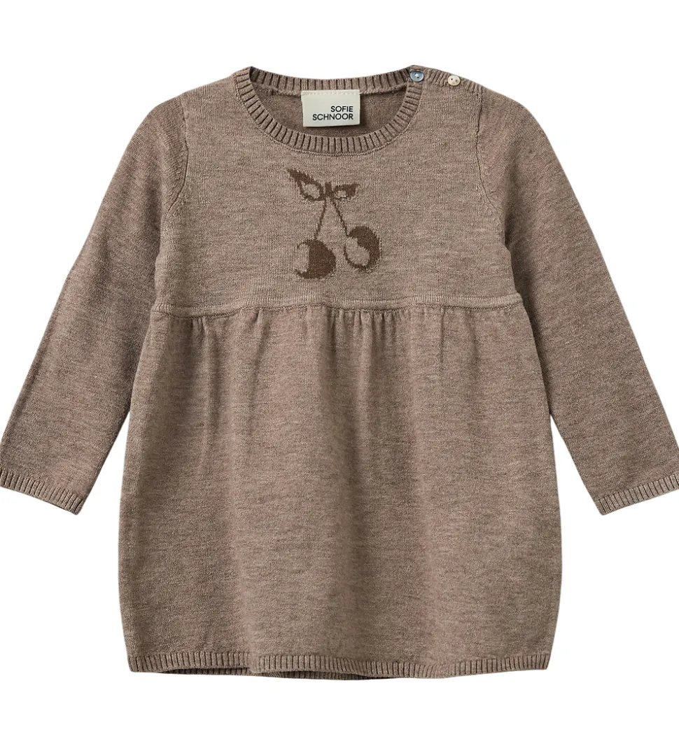 Elegant Sofie Schnoor kjole i en brunmeleret nuance med kirsebærmotiv på brystet. Sofie Schnoor kjolen har lange ærmer og en blød ribkant ved halsudskæringen samt knapper på skulderen.
