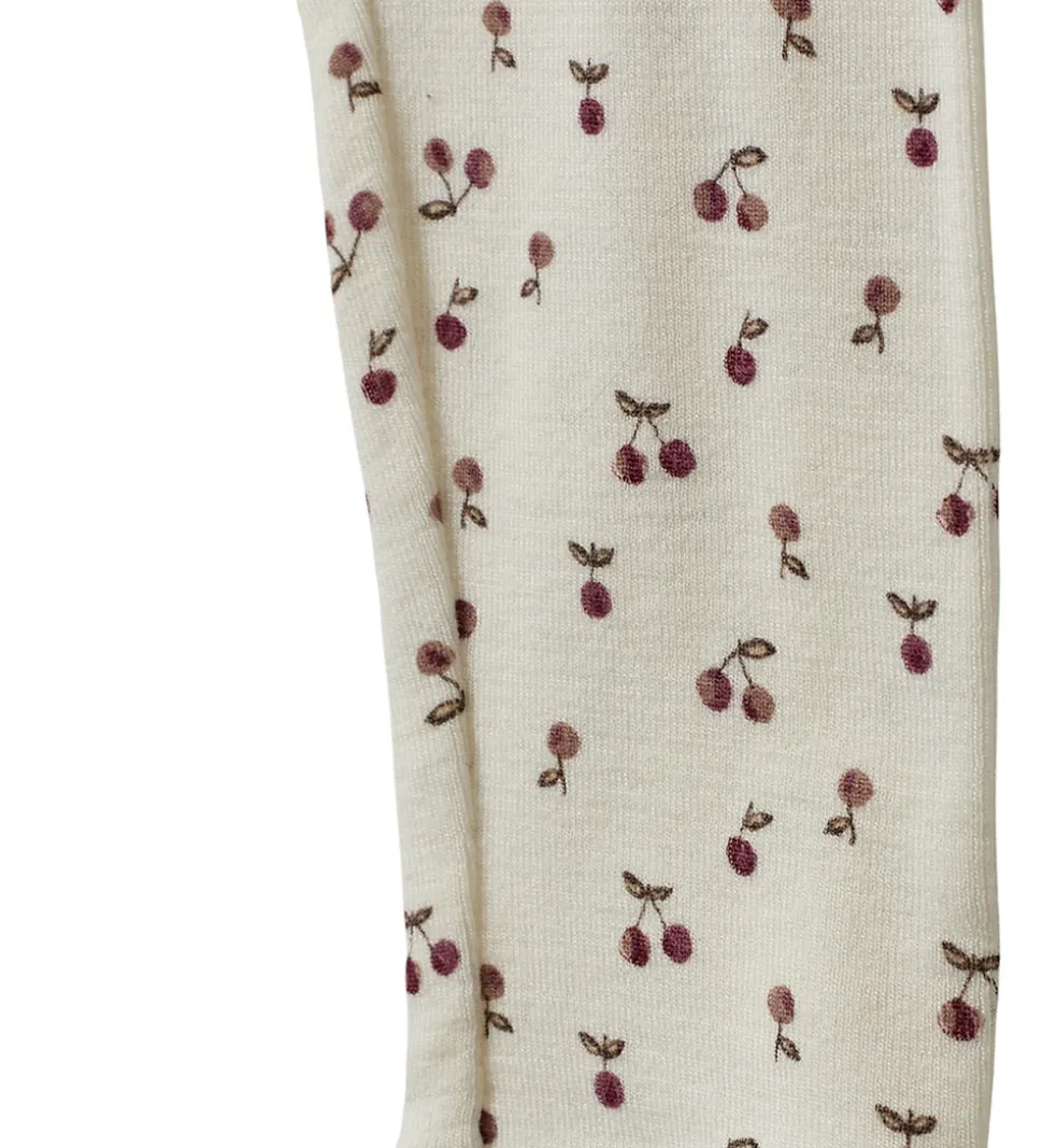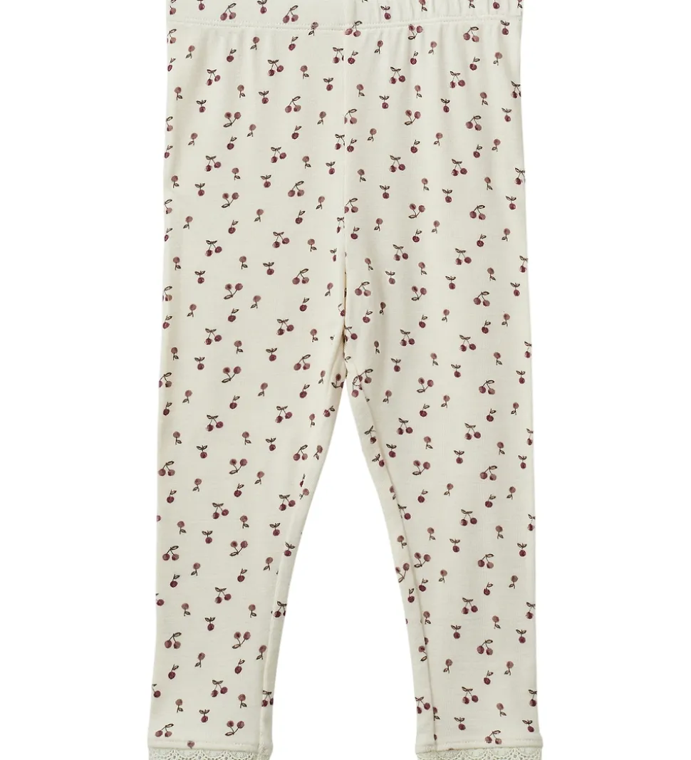 Fine Sofie Schnoor leggings i en lys, cremefarvet nuance med et delikat kirsebærprint. Sofie Schnoor leggingsene har en elastisk talje og en fin blondekant nederst i benene.
