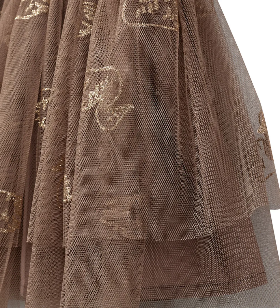 Elegant Sofie Schnoor nederdel i brun tyl med et flot print af guldfarvede ænder. Sofie Schnoor nederdelen består af et flerlaget design, der skaber en flot volumen.