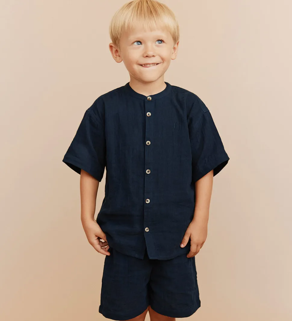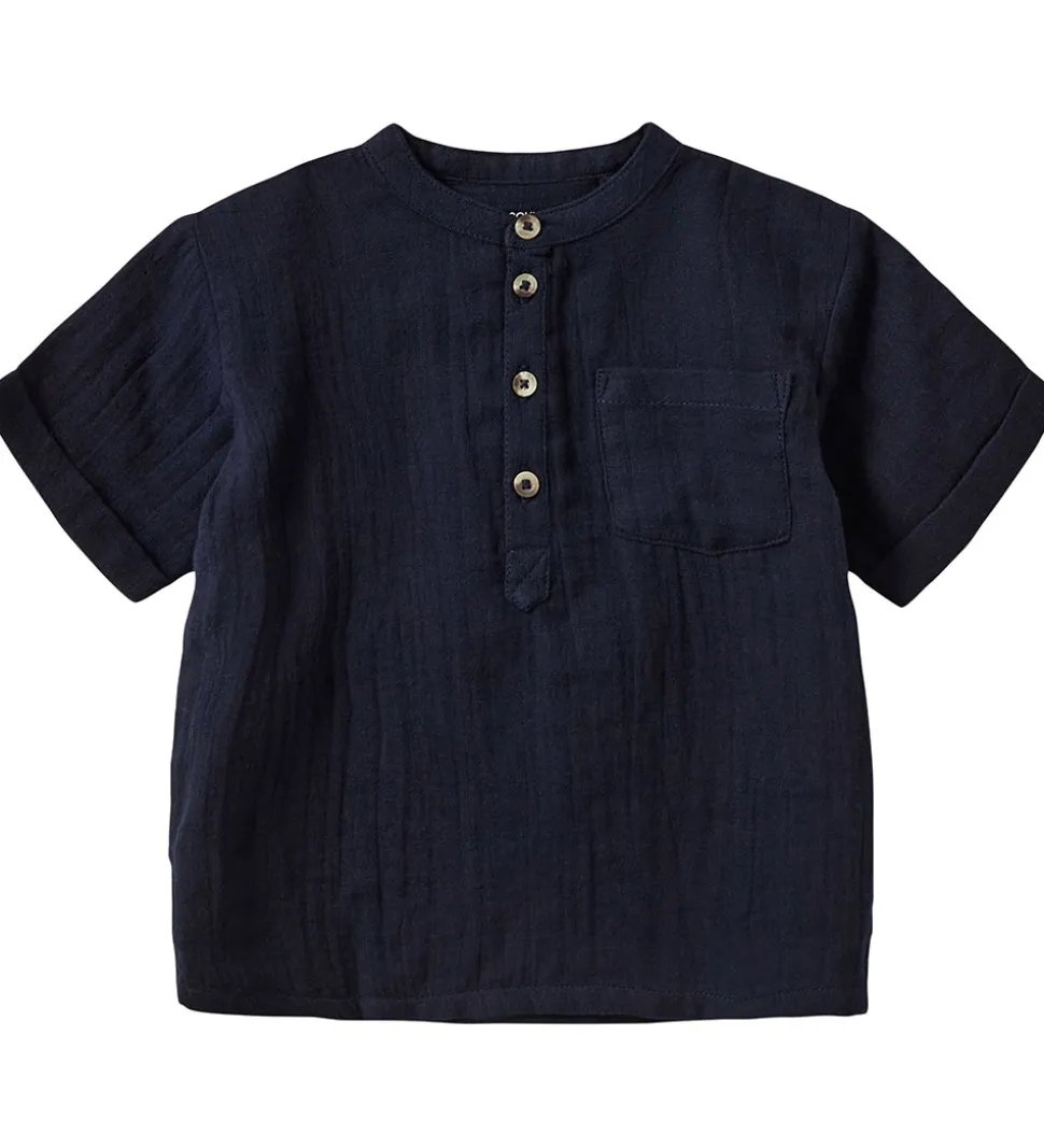 Sofie Schnoor skjorten har korte ærmer med fine fastsyet ombuk, og i halsåbningen er der en flot kinakrave. Fortil åbnes skjorten ned til midt på sjorten med knapper i en stolpelukning. Skjorten er i en blød, fastvævet bomuldskvalitet.
