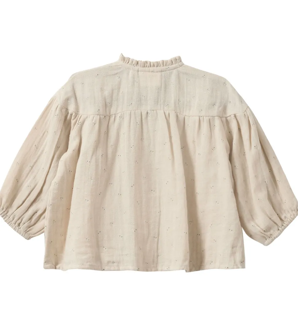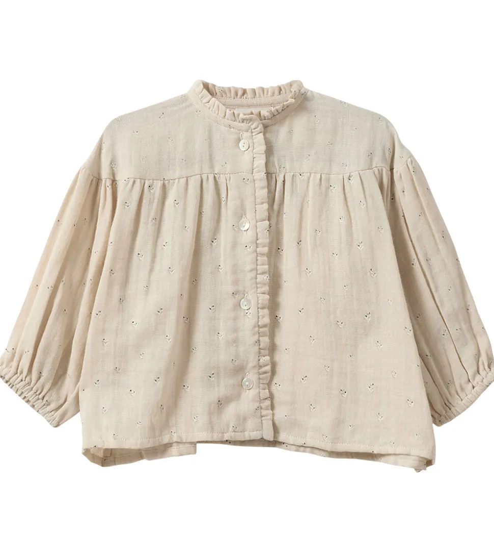 Charmerende Sofie Schnoor skjorte med lange ærmer i en lys beige nuance, udsmykket med blomsterprint. Skjorten har en fin flæsekant ved kraven og knaplukning foran.