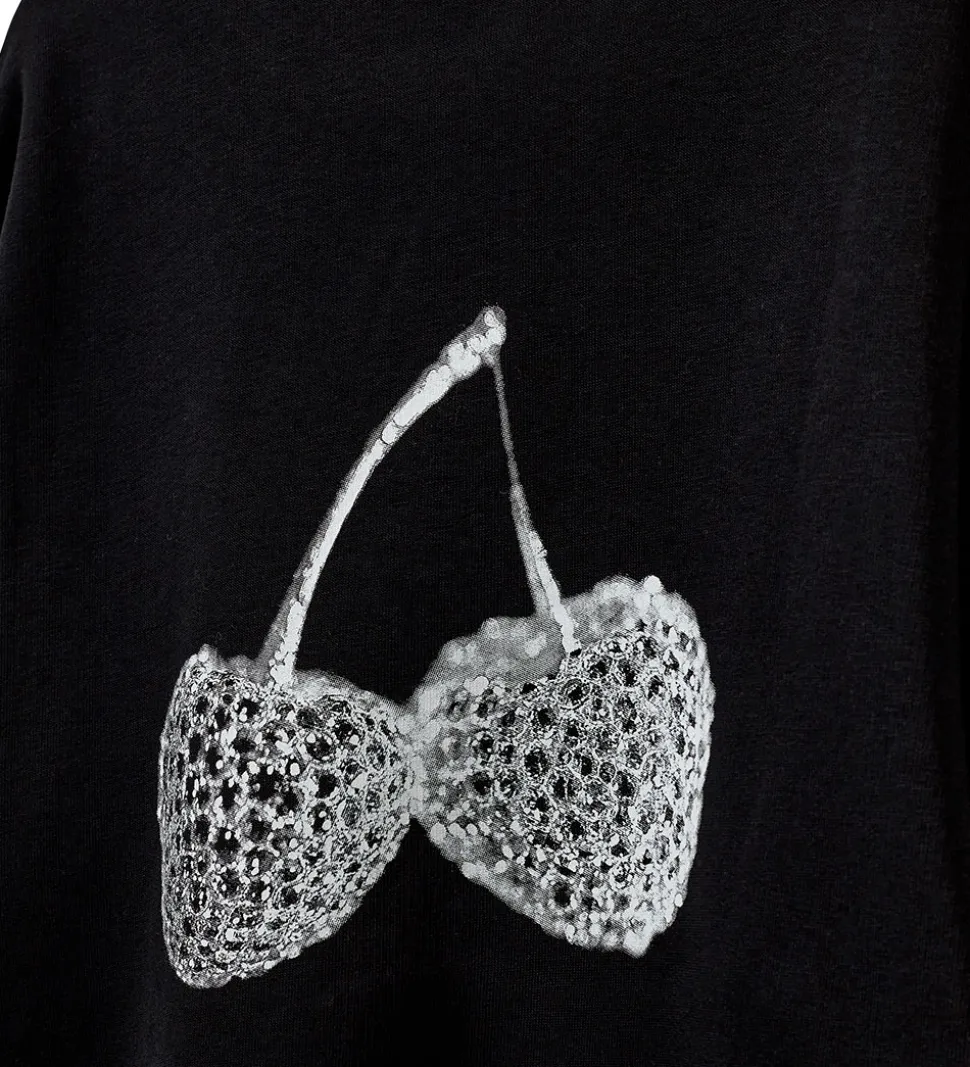 Stilfuld sweatshirt fra Sofie Schnoor i en dyb, sort farve. Sofie Schnoor sweatshirten har en rund halsudskæring og lange ærmer. På brystet præsenteres et subtilt tekstprint og et stort kirsebærprint på ryggen i hvid.