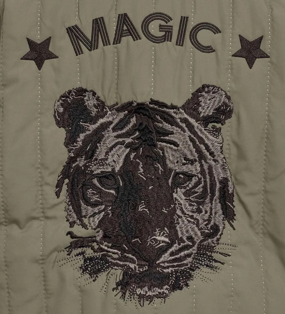 Skøn Petit by Sofie Schnoor termojakke i armygrøn med en broderet tiger og teksten “MAGIC” på ryggen. Termojakken er med en quiltet struktur.