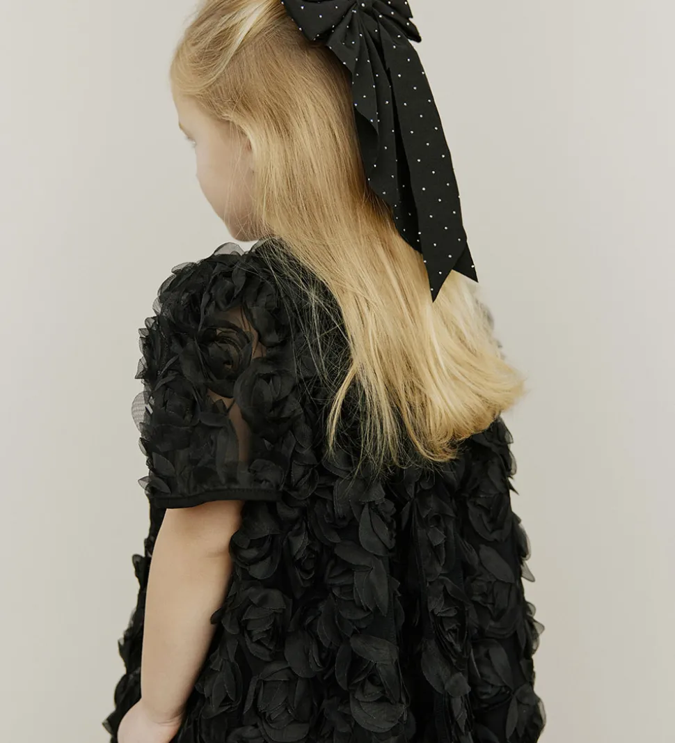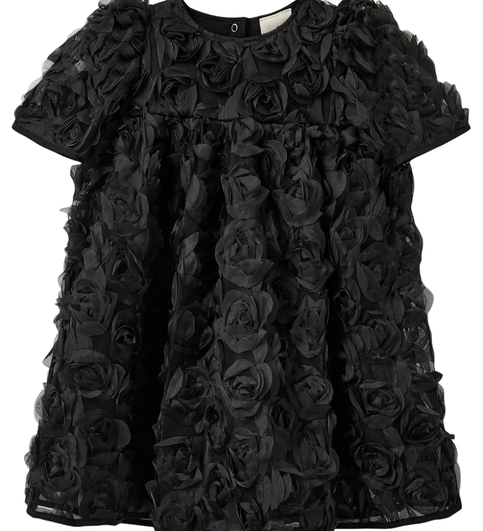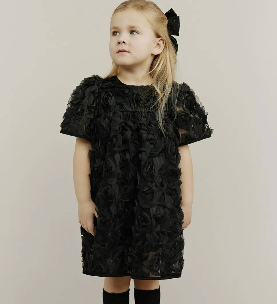 Elegant Sofie Schnoor tylkjole i sort med et imponerende rosenmønster af tyl. Sofie Schnoor tylkjolen har korte ærmer og en rund halsudskæring. Alle overflader er dækket af detaljerede blomsterapplikationer, der skaber et tredimensionelt udtryk.