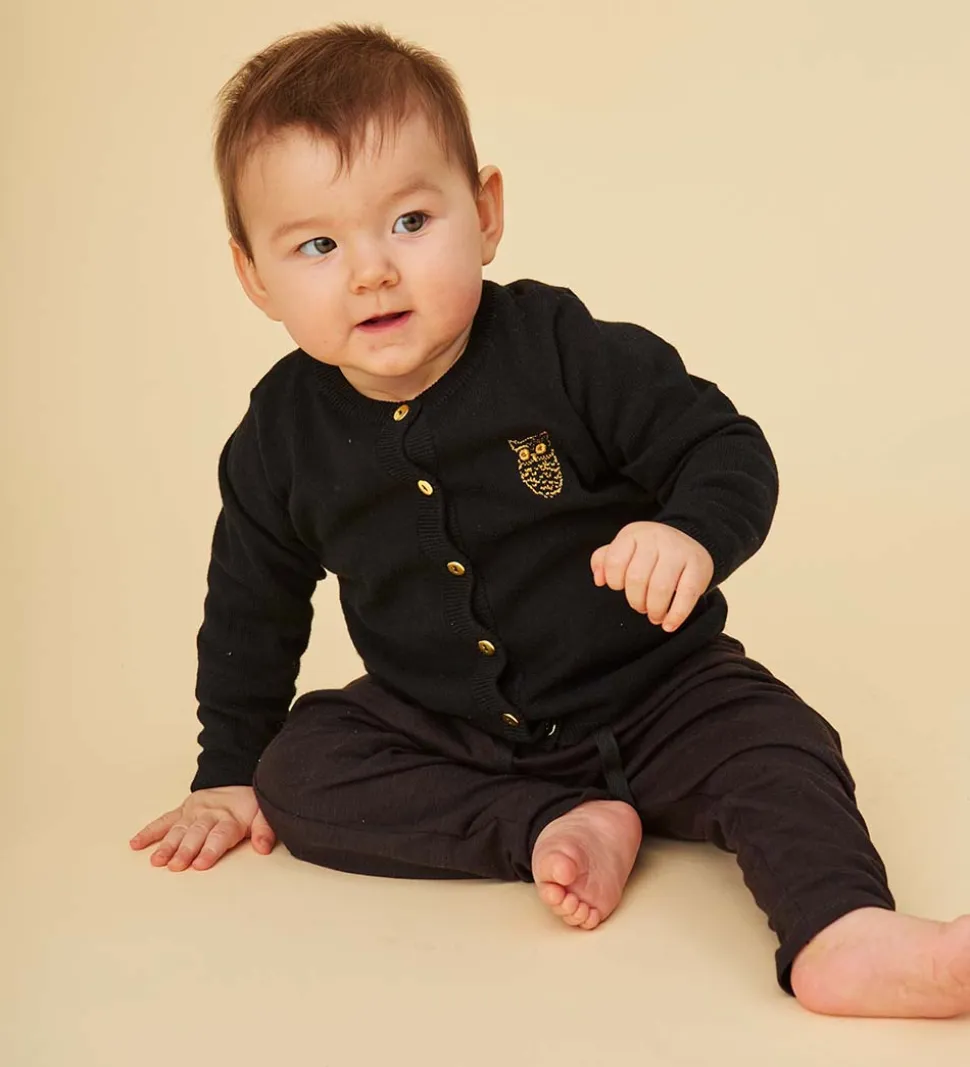 Lækker Soft Gallery cardigan i ensfarvet sort med fine guld knapper, samt broderi af en guld ugle på venstre bryst.