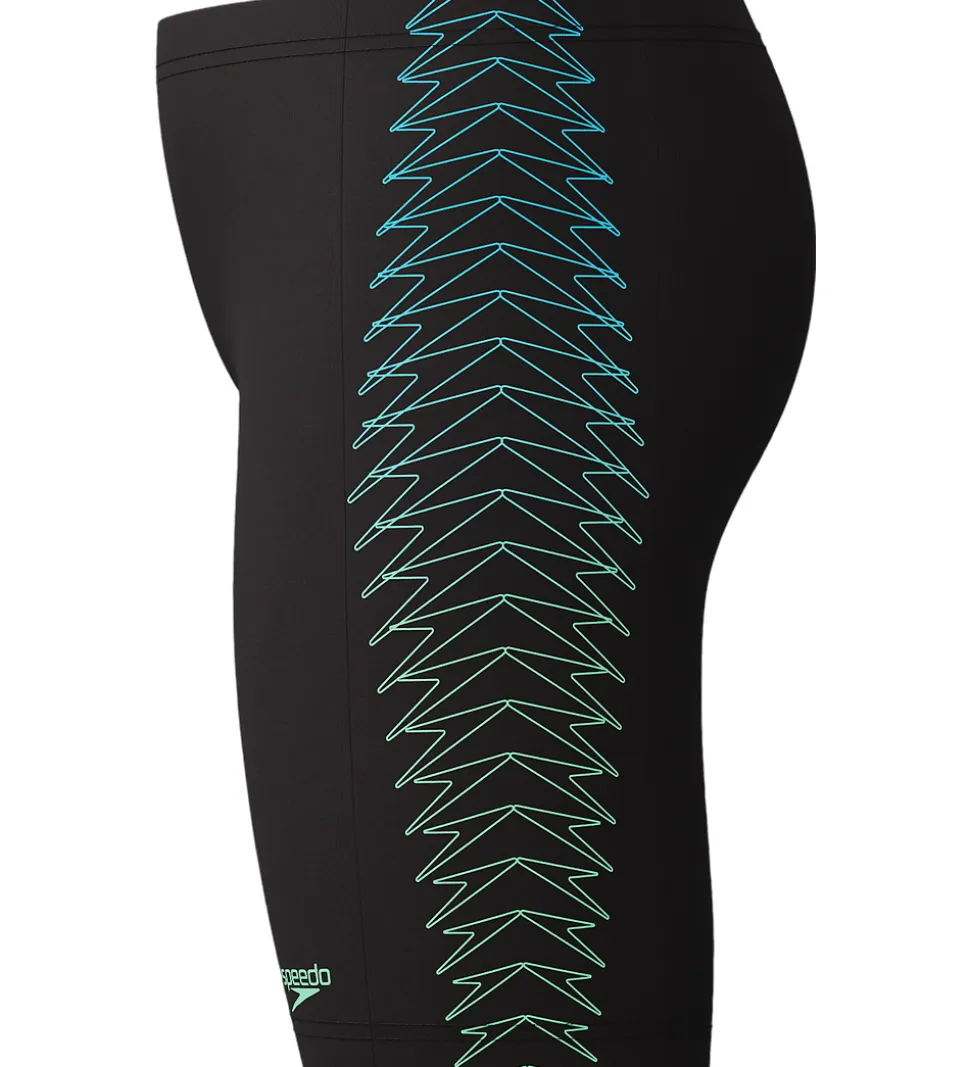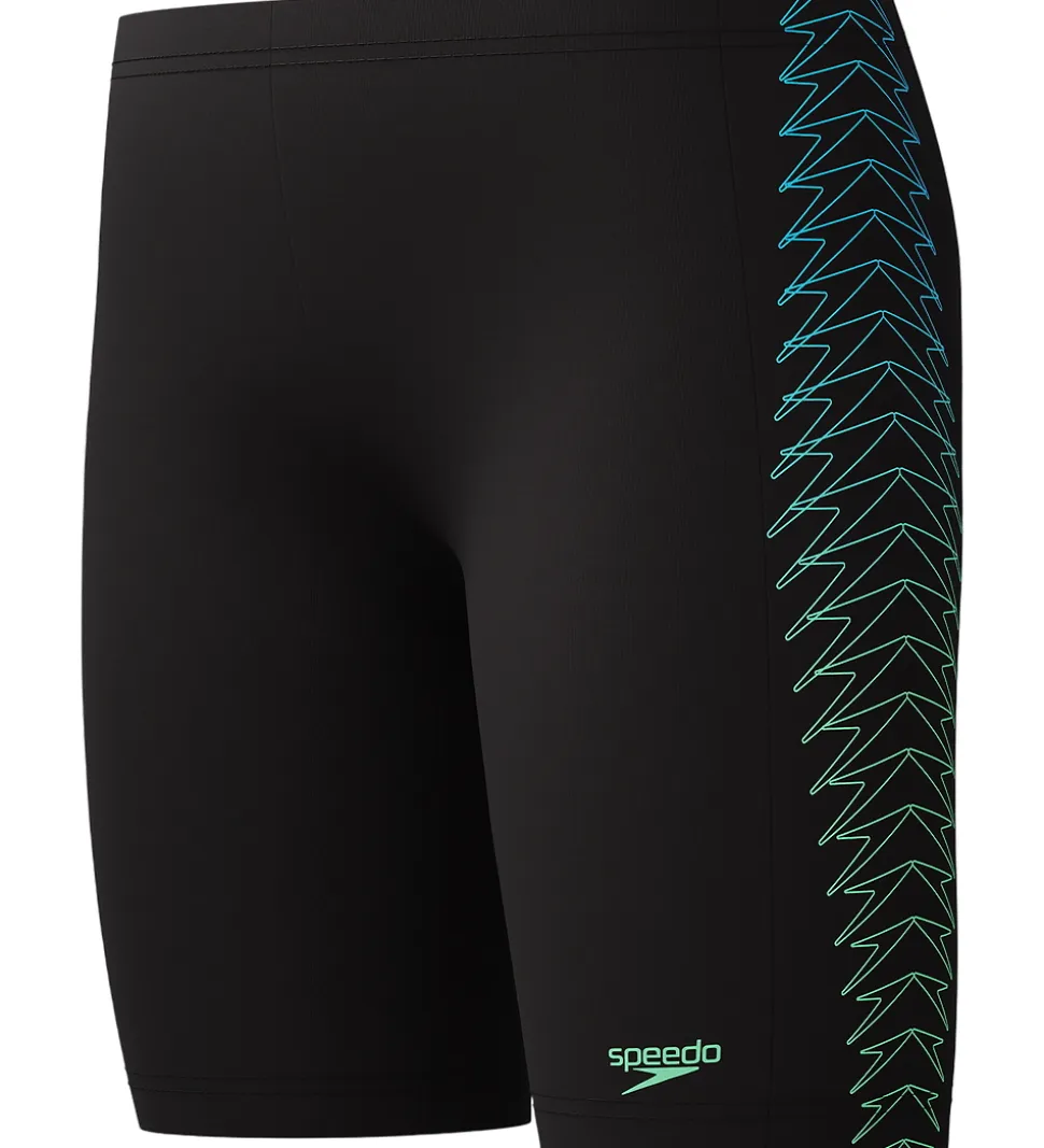 Lækre Speedo badebukser i sort, og i venstre side er der et flot mønster i grønne nuancer.