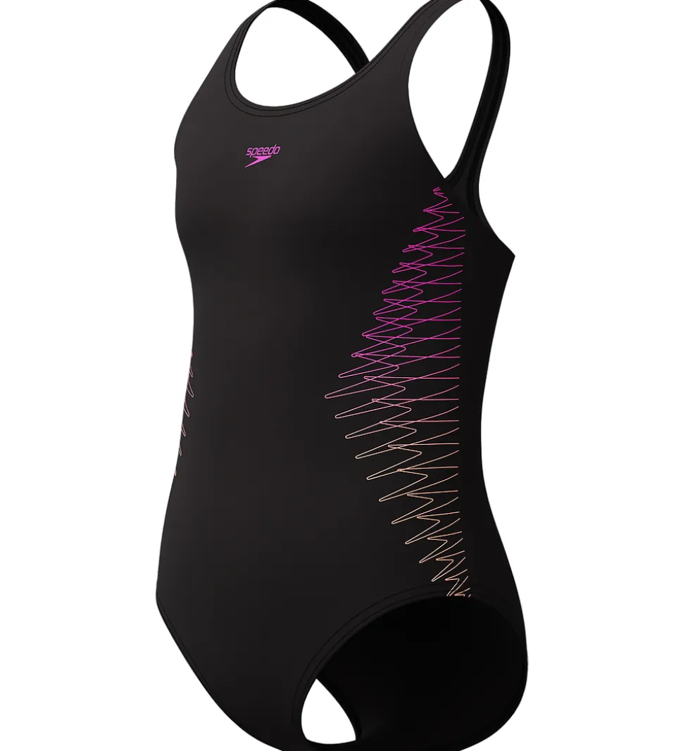 Smart Speedo badedragt i sort, og i siderne er der et flot mønster i pink nuancer.