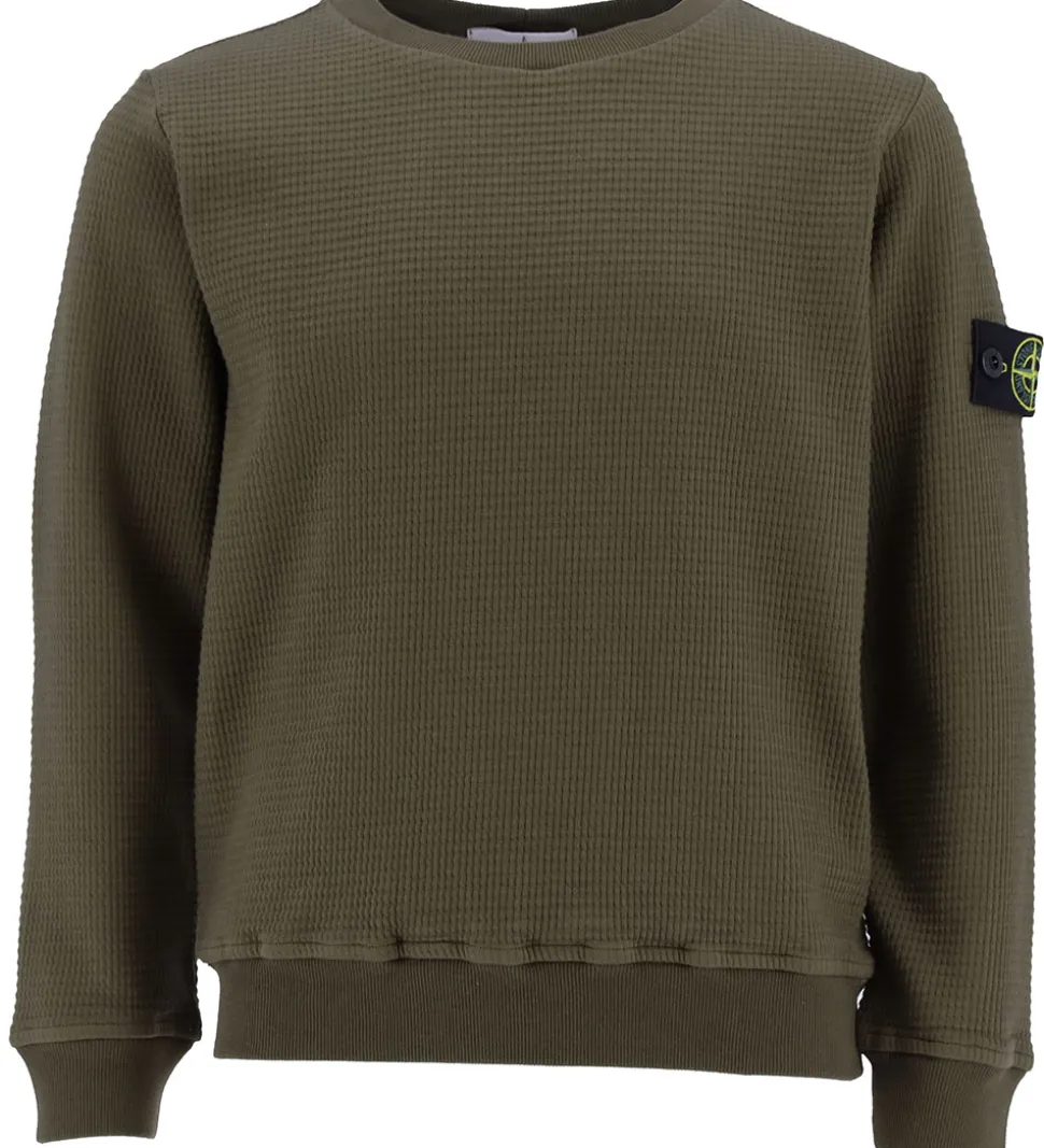 Smart Stone Island bluse i ensfarvet armygrøn med en flot vaffelstruktur. Øverst på venstre ærme sidder det ikoniske logomærke fast med knapper.