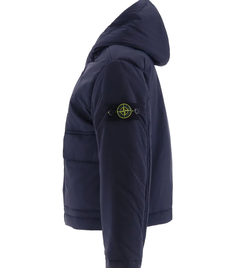 Flot Stone Island dynejakke i ensfarvet navy, og øverst på venstre ærme sidder det ikoniske logomærke fast med knapper.