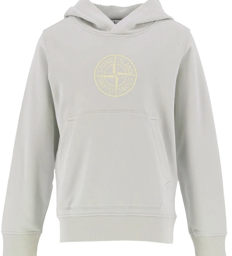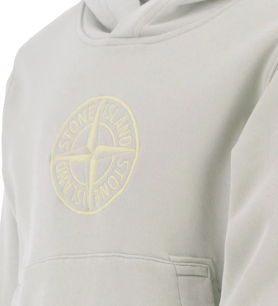 Fin Stone Island hættetrøje i hvidgråt sweat, og fortil er der broderet et stort logo i hvid.
