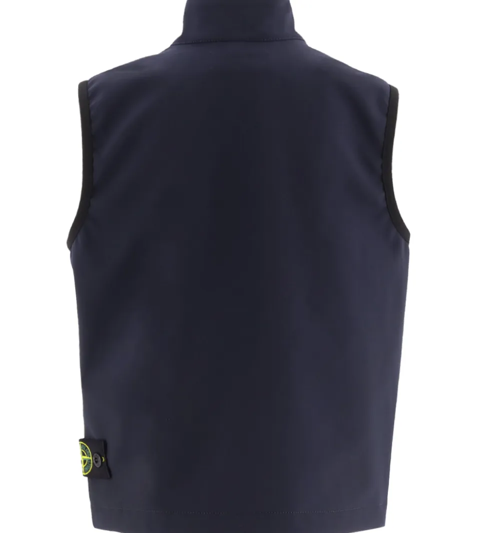 Lækker Stone Island softshellvest i ensfarvet navy, og nederst i venstre side sidder det ikoniske logomærke fast med knapper.