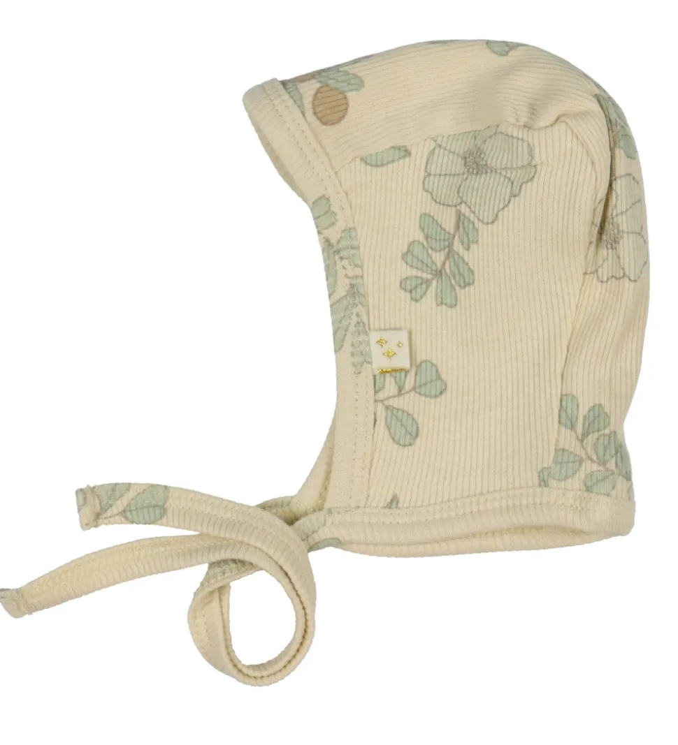 Sød Thats Mine babyhjelm i beige med et allover print af blomster og bær i grønne og orange nuancer.