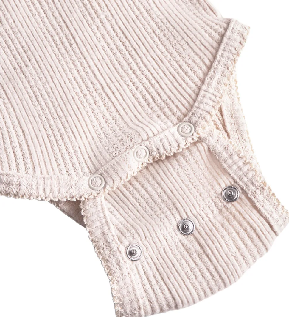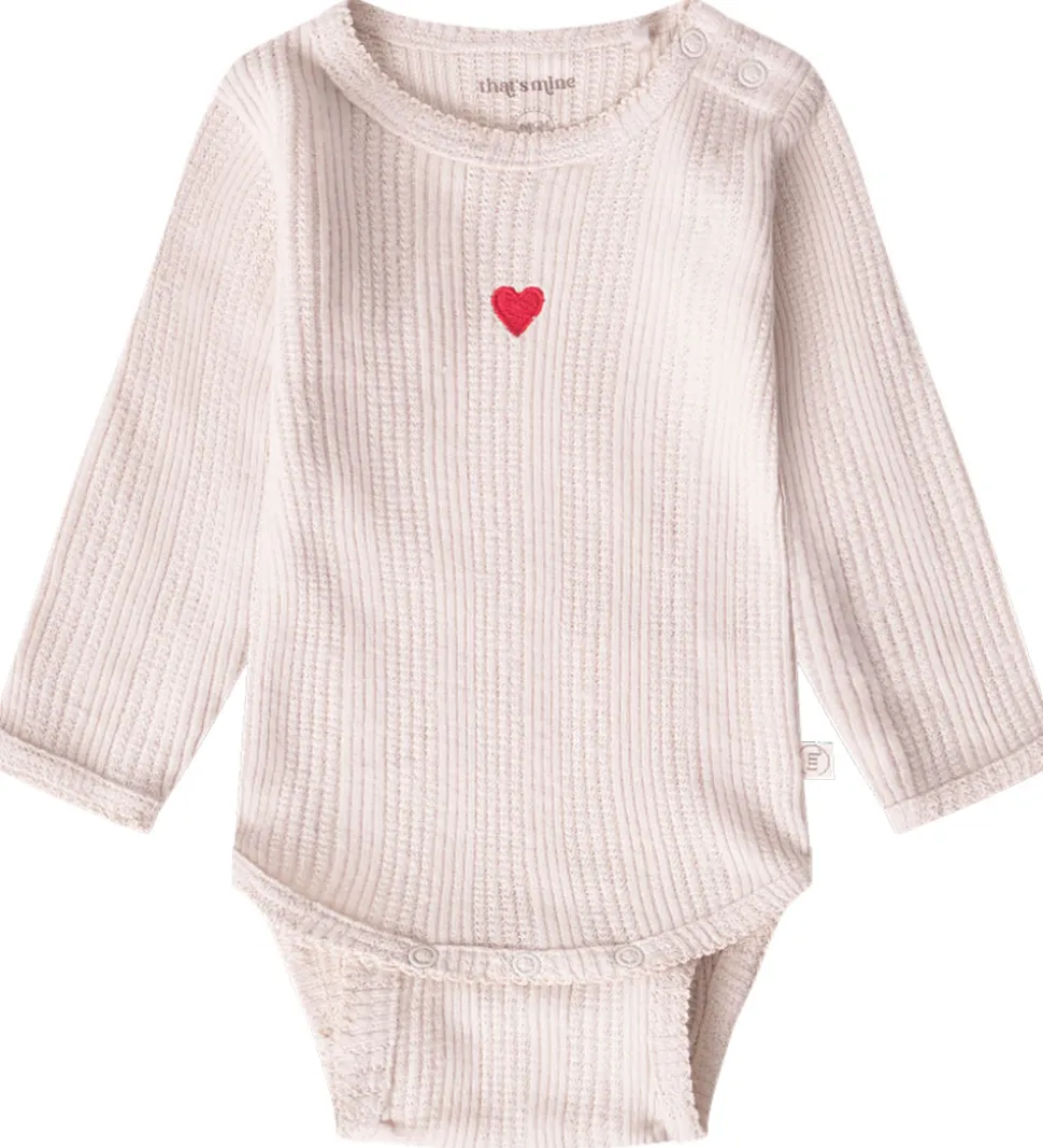 Charmerende Thats Mine body i en lysebeige nuance med ribstruktur og et fot hulmønster. Detaljeret med et lille, rødt hjerte på brystet, som tilføjer et fint præg.