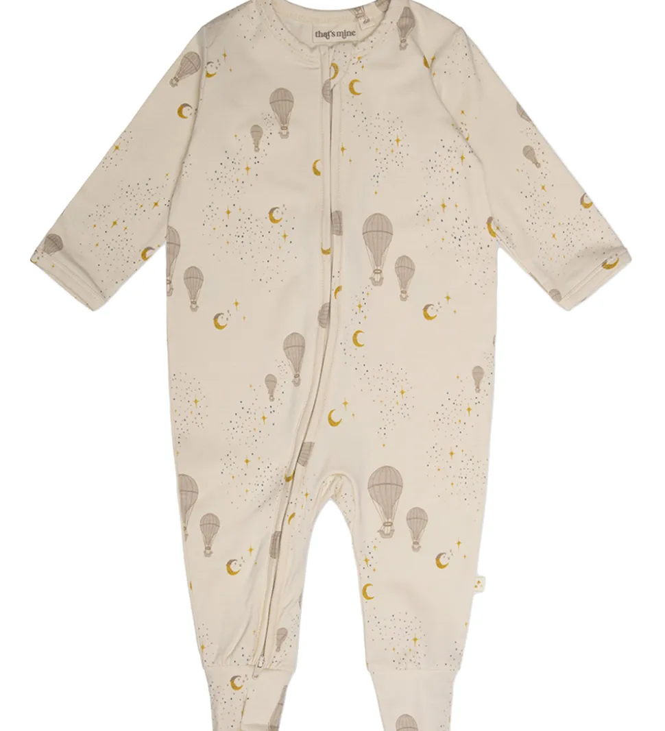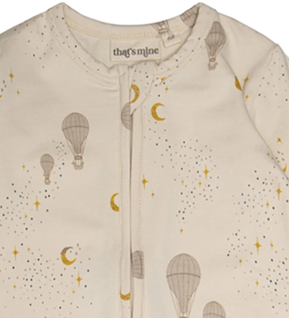 Pæn That’s Mine heldragt i cremehvid med et alloverprint af luftballoner, måner og stjerner i beige og gule farver.