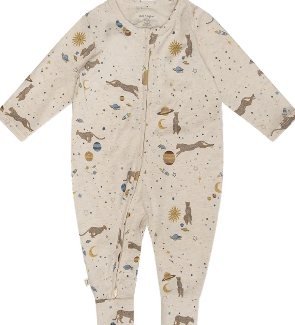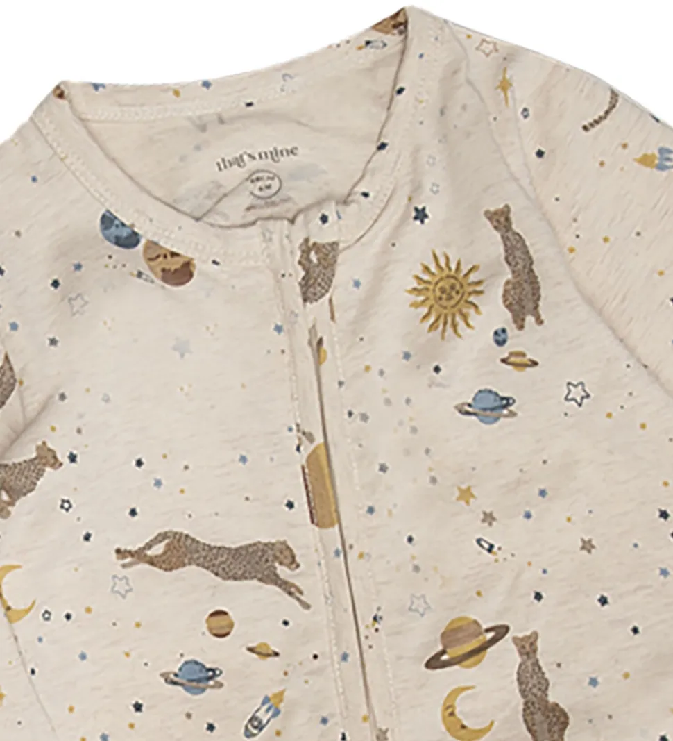 Charmerende That’s Mine heldragt i en lys beige nuance med et fint print af stjerner, rumraketter, planeter og geparder.