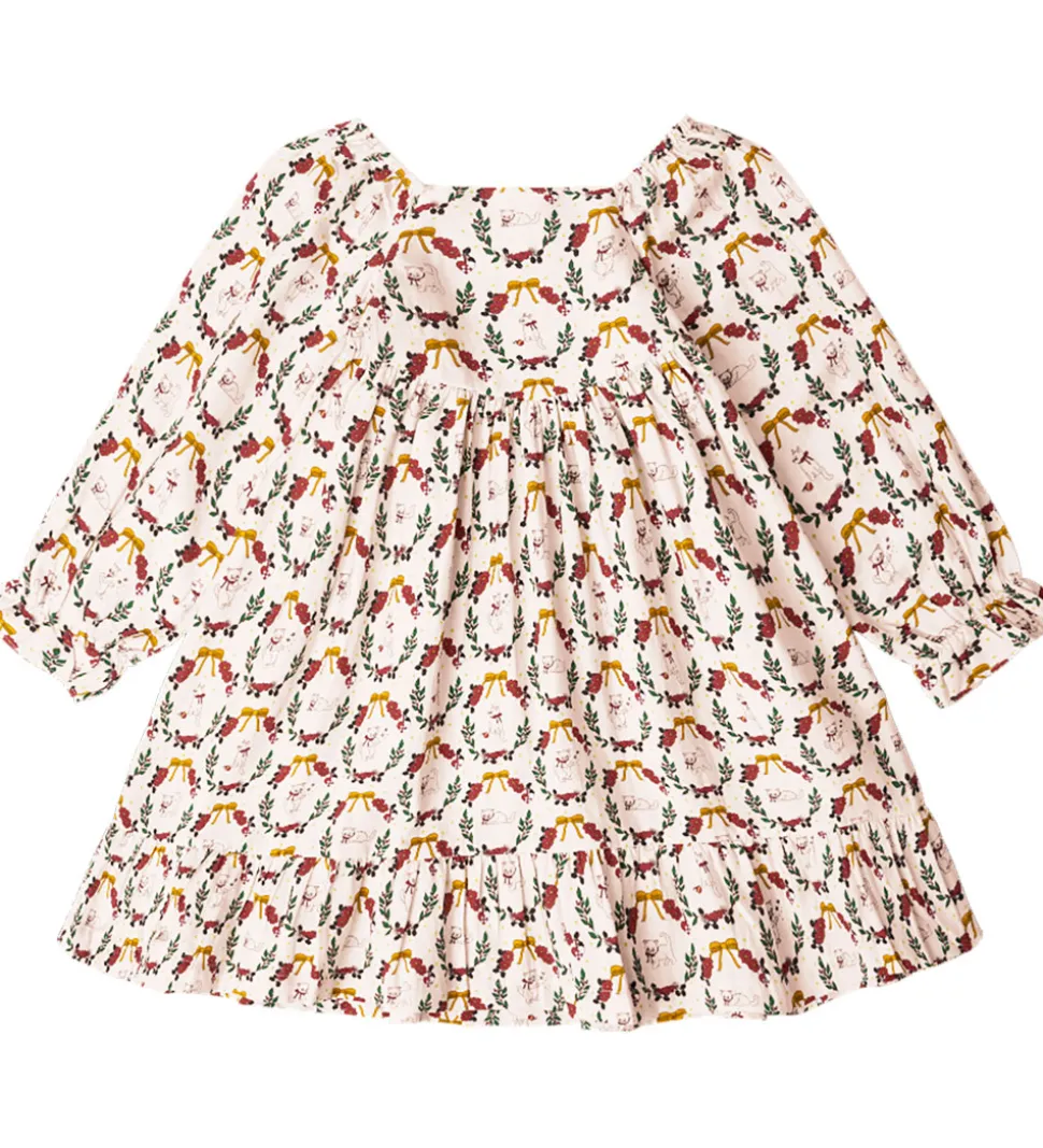Elegant kjole fra Thats Mine i en lys beige nuance med et charmerende juleprint. Kjolen har lange ærmer og en løs pasform med flæsedetaljer ved bunden for et luftigt udtryk. Thats Mine kjolen er designet i et let materiale, der sikrer bevægelighed.