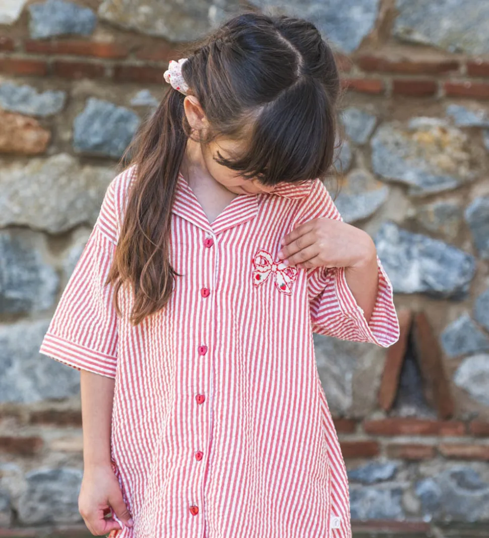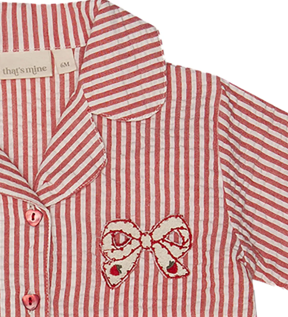 Skøn Thats Mine skjorte med korte ærmer i rød med fine hvide striber og en charmerende sløjfeapplikation broderet på fronten. Skjorten har en fin struktur i stoffet og fine hjerteknapper.