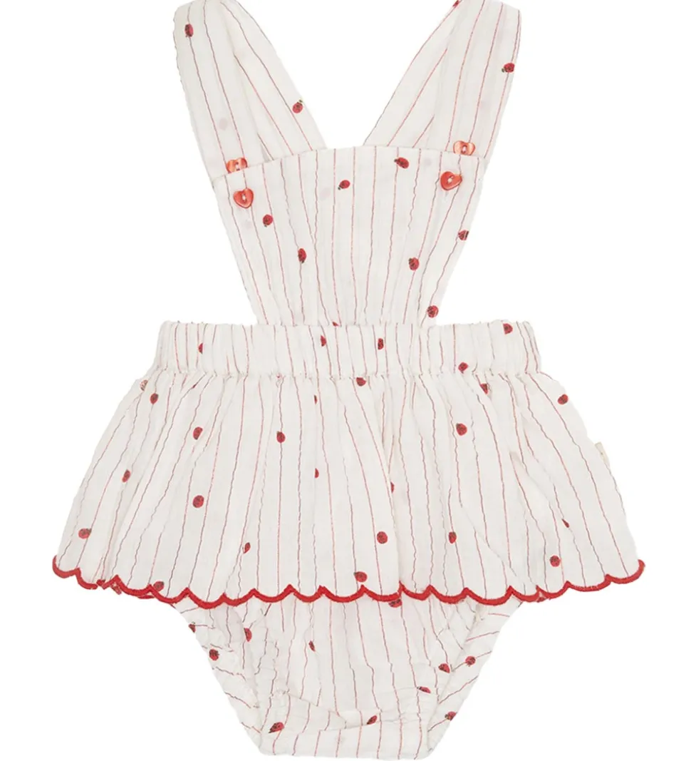 Fin That’s Mine sommerdragt i hvid med lodrette, skinnende striber i rød, samt med et alloverprint af små mariehøner.
