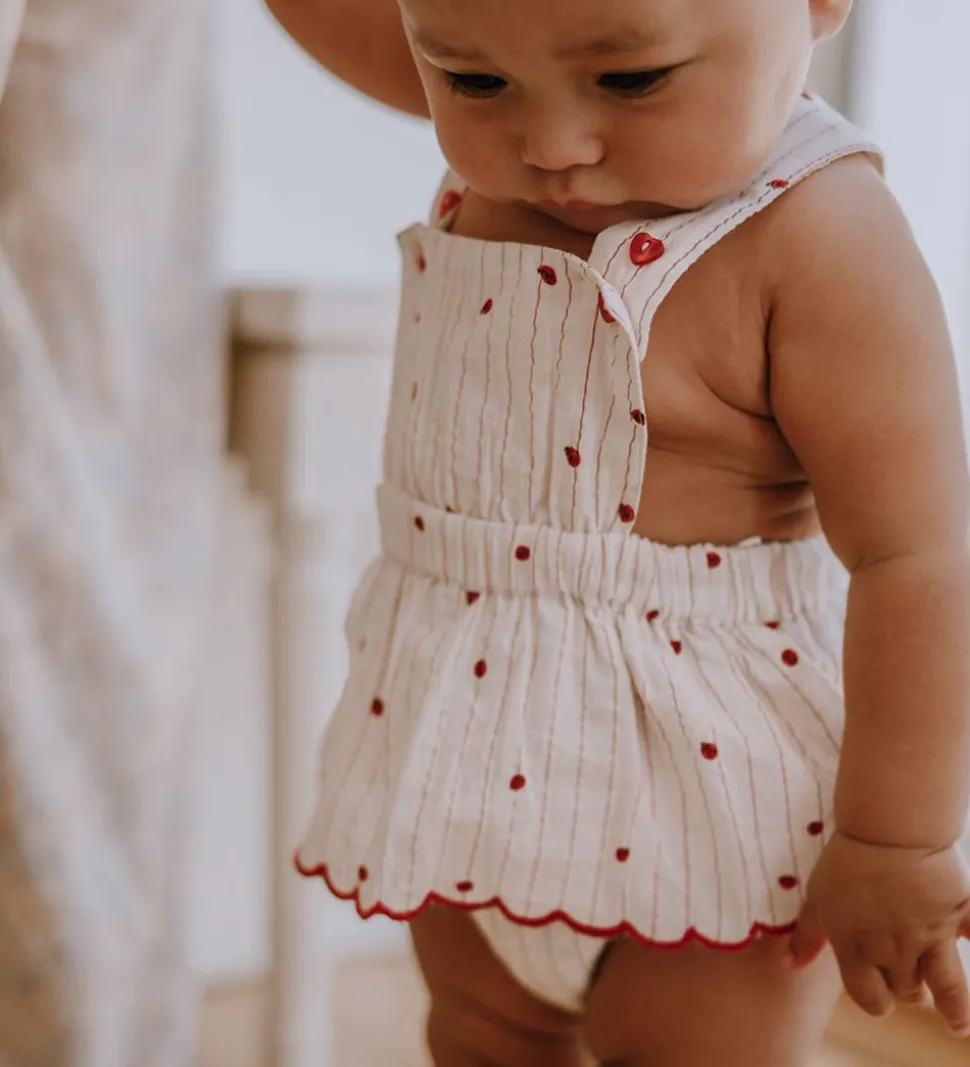 That’s Mine sommerdragen er uden ærmer, og har justerbare skulderstropper med to indstillinger. I taljen er der en god elastikkant hvor et skørt med fine folder starter. I benåbningerne er der smalle elastikkanter og sommerdragten er i en lækker bomuldskvalitet.