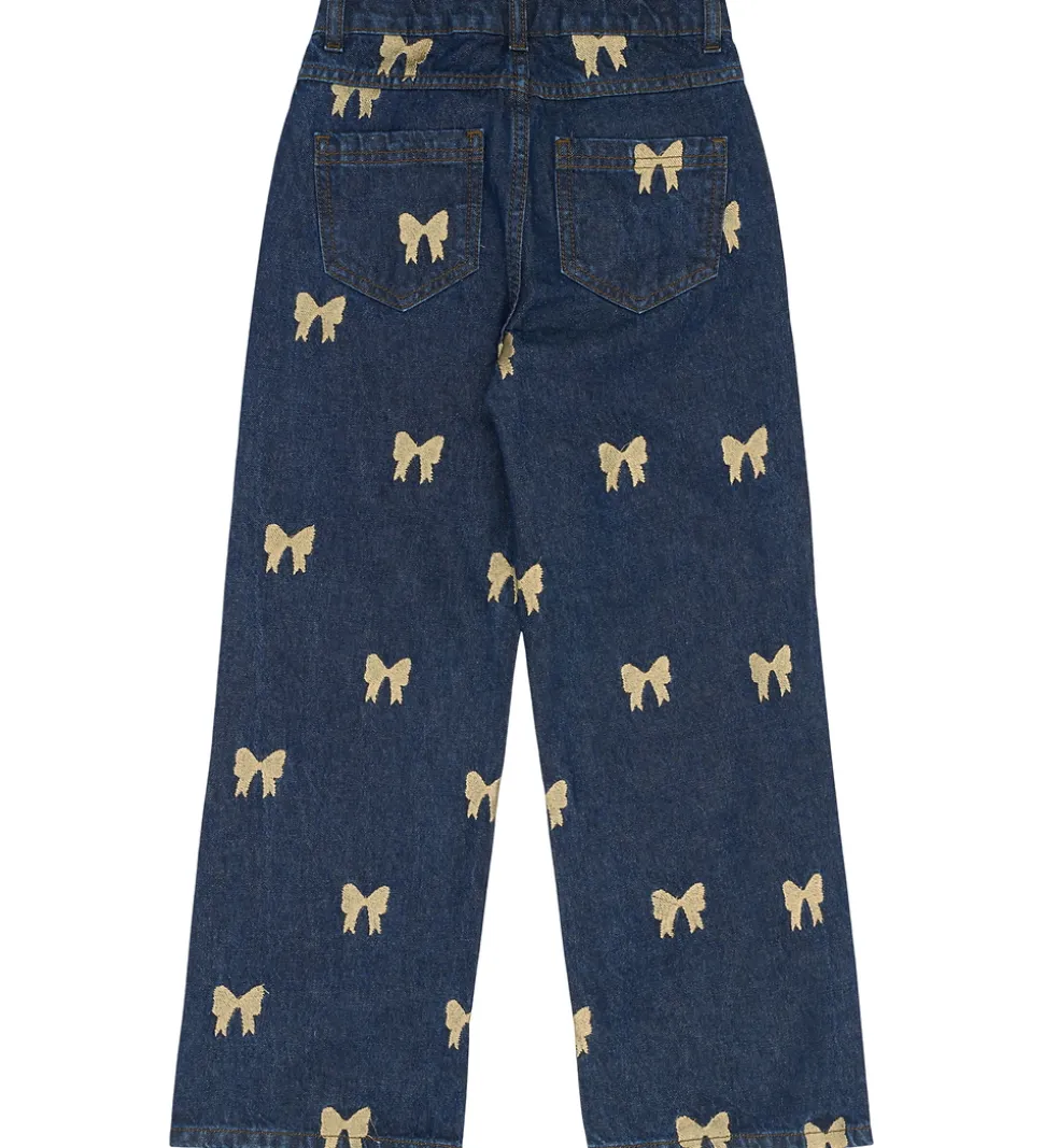 Stilfulde jeans fra The New i mørkeblå med broderede sløjfer i guld. The New jeansene har en elastisk talje, som kan justeres med knapper indvendigt. De lukkes fortil med en hægte og lynlås. Jeansene har bæltestropper og lommer på for- og bagside. De har en afslappet pasform med brede ben.