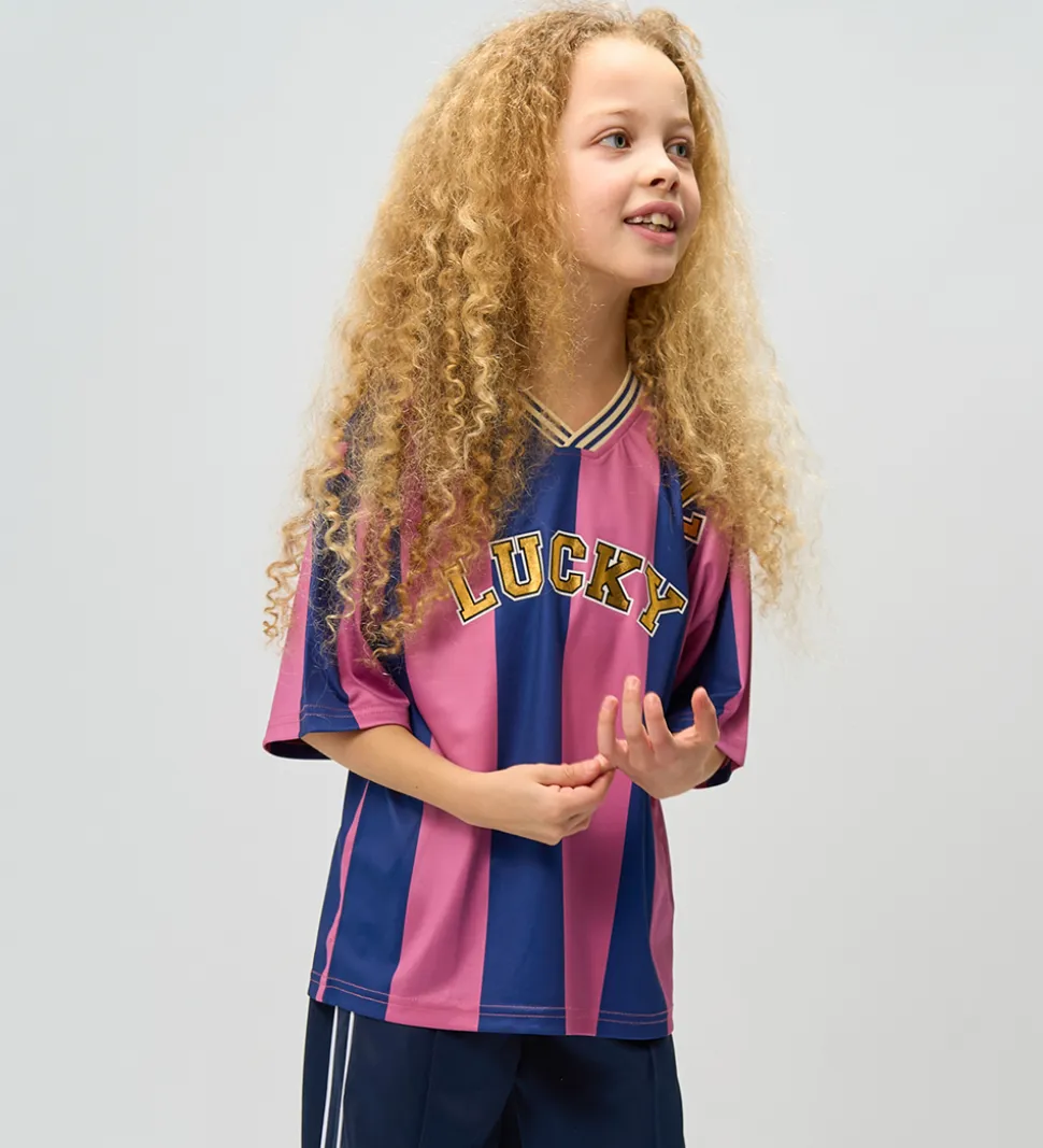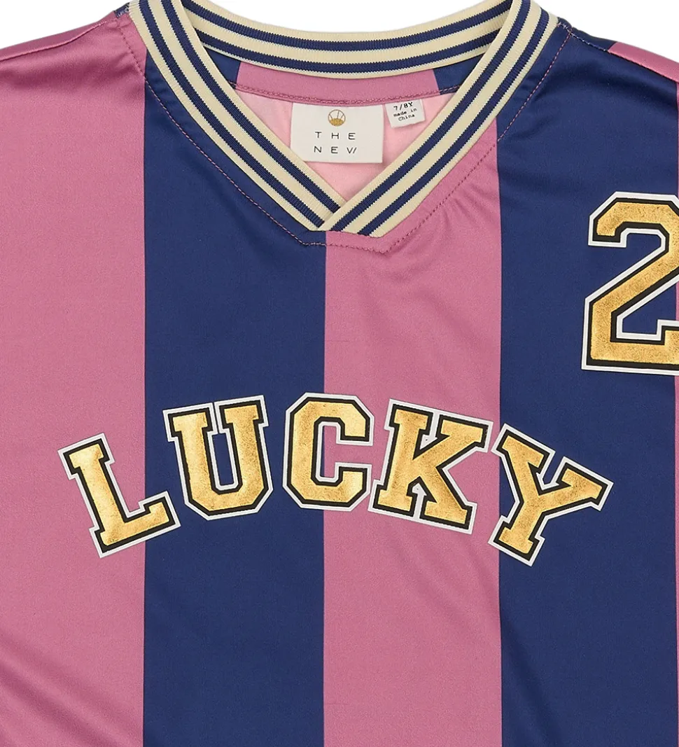 T-shirten har et markant print foran med teksten “LUCKY” i gule bogstaver samt tallet “2” på brystet og ryggen. The New t-shirten har en V-udskæring med en fin ribkant, der matcher t-shirtens sporty design.