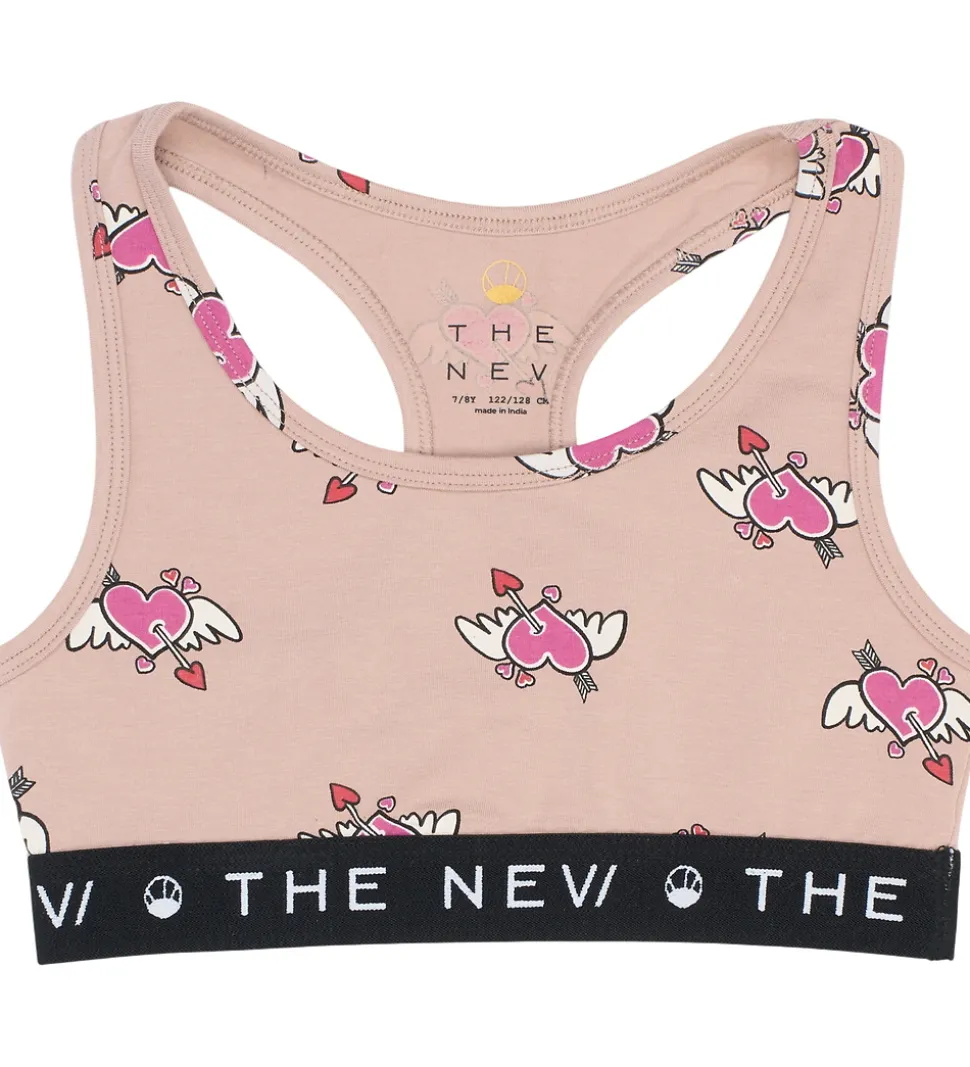 - Støvet rosa med print over det hele af et bevinget hjerte og en pil.