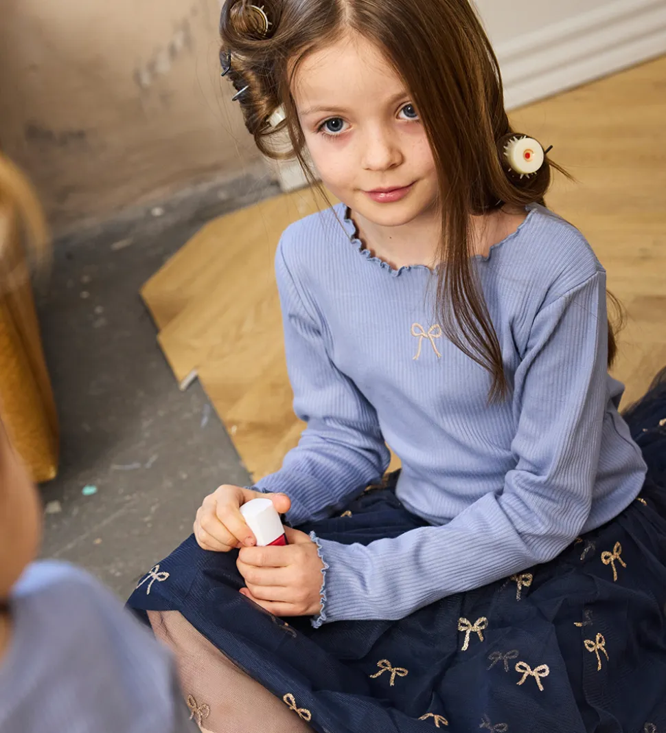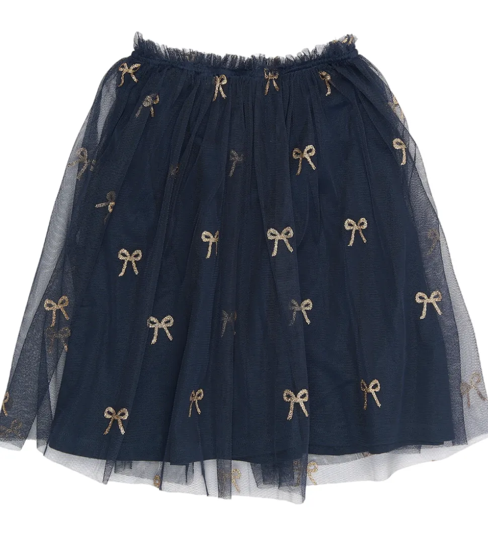 Elegant The New tylnederdel i mørkeblå med små, gyldne sløjfer. The New tylnederdelen har en let tyl-struktur med et elastisk bånd i taljen. Tylnederdelen præsenterer et gennemsigtigt ydre lag, der tilfører et ekstra strejf af finesse.