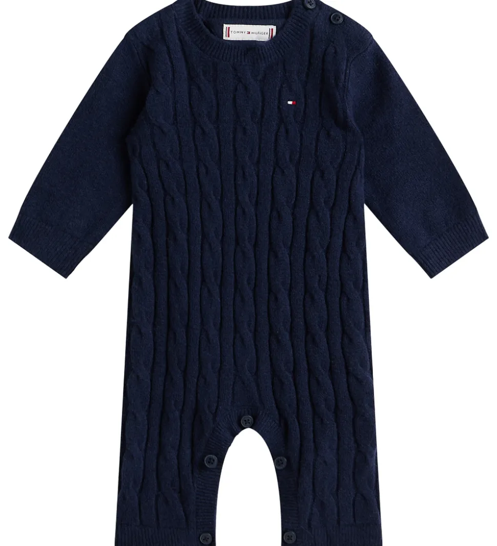 Elegant Tommy Hilfiger heldragt i navyblå med et flot kabelstrikmønster. Tommy Hilfiger heldragten har en rund halsudskæring med knapper ved venstre skulder. Den har lange ærmer og lange ben med knapper mellem benene.