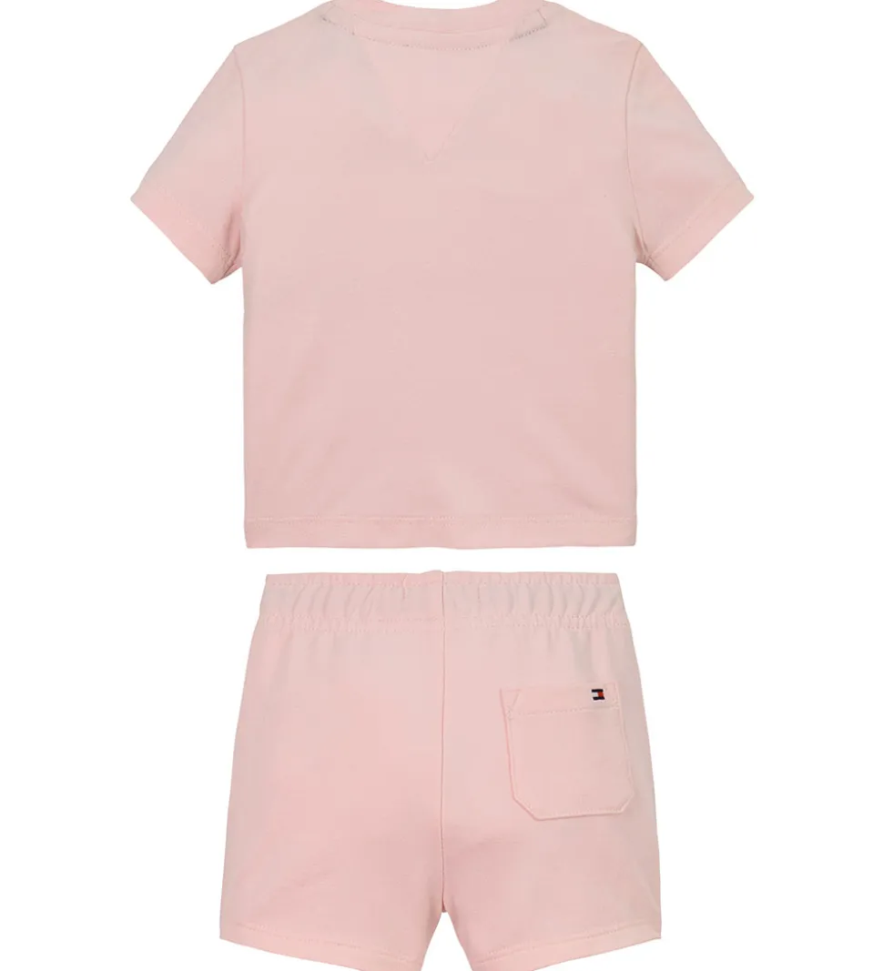 Charmerende Tommy Hilfiger shortssæt i rosa bestående af et t-shirt med hvidt logoprint på fronten og et par shorts. T-shirten har en rund halsudskæring med en smal ribkant og praktiske trykknapper ved venstre skulder. Shortsene har en bred elastik i taljen, som kan justeres med snøre fortil. Øverst er der en lomme i hver side og bagtil er der en lomme i højre side.