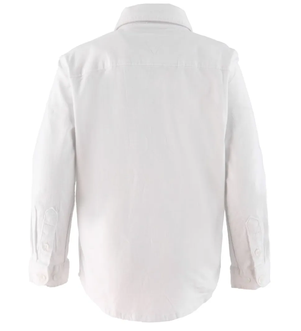 Fin Tommy Hilfiger skjorte i ensfarvet hvid med hvide knapper. Fortil er der broderet et lille logo, og som en smart detalje er den nederste knap fortil syet fast med en navy tråd.