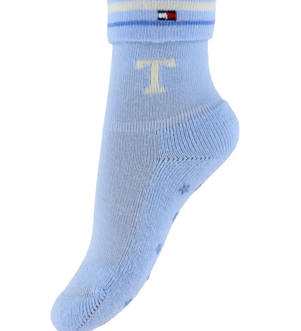 Attraktive Tommy Hilfiger strømper i en 2-pak. Det ene par er lyseblåt med et diskret “T”-mønster, mens det andet par har vandrette striber i blå og hvid. Begge par har en smal elastikkant i toppen og ommy Hilfiger logoet er diskret placeret ved elastikken.
