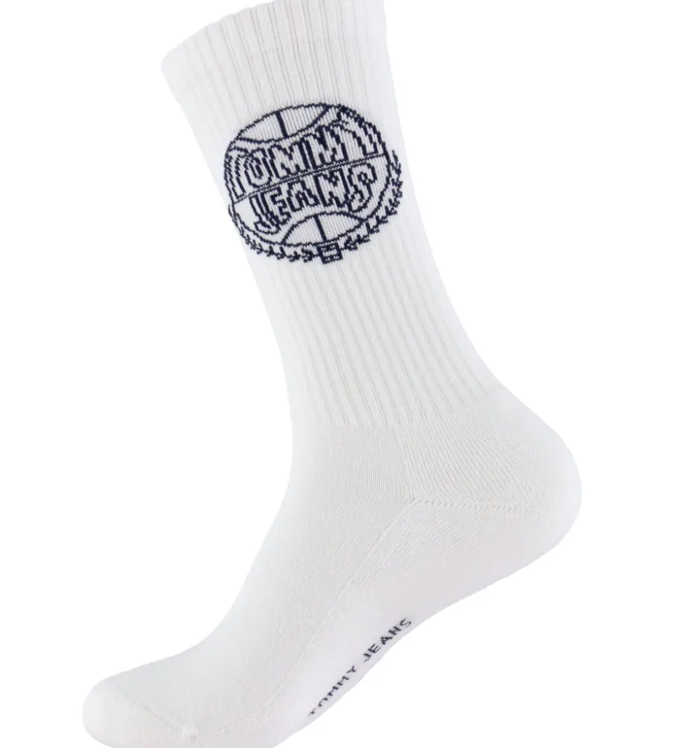 Stilfulde Tommy Hilfiger strømper i en 3-pak, der inkluderer hvide og marineblå varianter. To hvide strømper har forskellige tryk, mens den marineblå har “TOMMY JEANS” skrevet. Strømperne har elastiske ribkanter øverst i kontrastfarver som rød og marineblå, hvilket giver en god pasform.