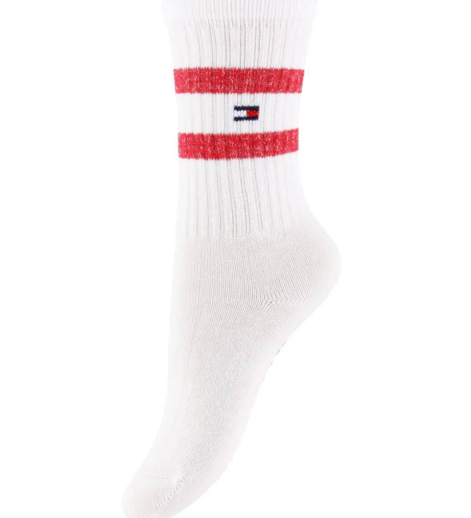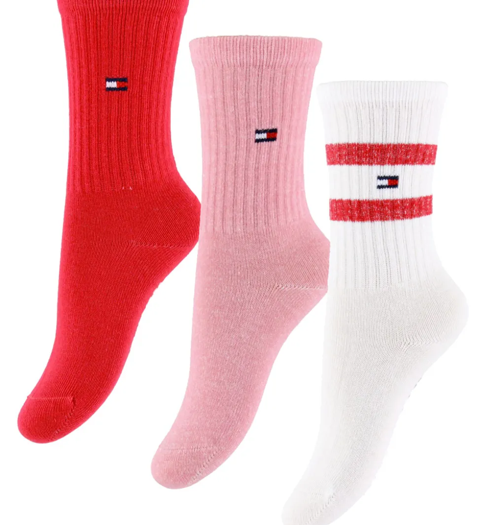 Attraktive Tommy Hilfiger strømper solgt i en 3-pak med farverne rød, rosa og hvid. De røde og rosa strømper har Tommy Hilfiger-logoet ved anklen, mens den hvide har to vandrette, røde striber samt logo. Alle strømperne har ribstruktur på skaftet.