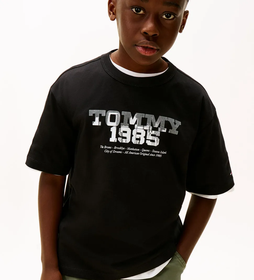 Elegant Tommy Hilfiger t-shirt i sort med et stort, tydeligt tryk på forsiden. Tommy Hilfiger t-shirten har en klassisk rund halsudskæring med en smal ribkant. Den lille logo på ærmet giver et subtilt touch til designet.