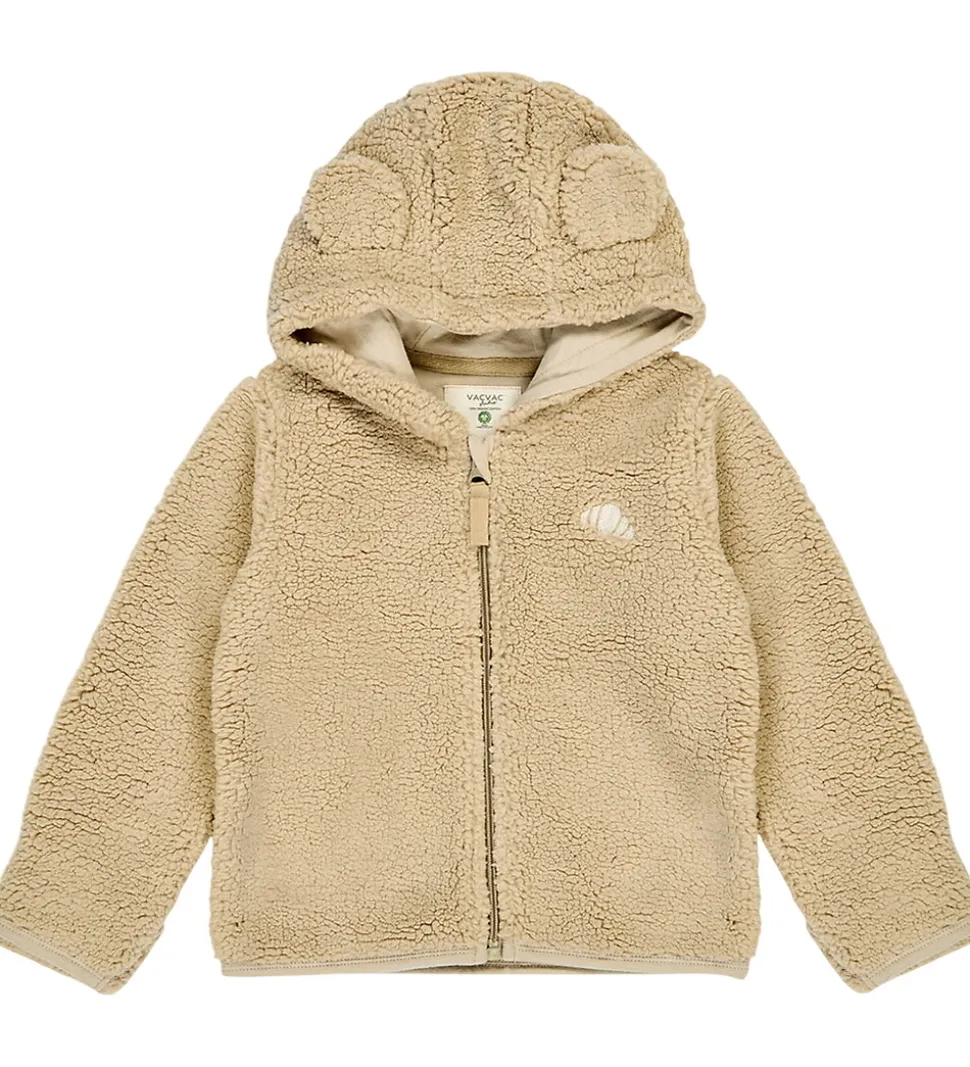 Indbydende VACVAC fleecejakke i en varm beige nuance. Fleecejakken er lavet af blødt teddyfleece og har en hætte med små ører, der tilføjer et sødt touch.