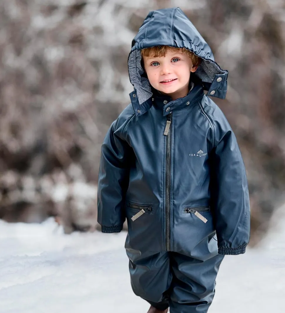 Flot Ver de Terre flyverdragt i ensfarvet navy med en vandtæt PU-overflade og med sorte lynlåse.