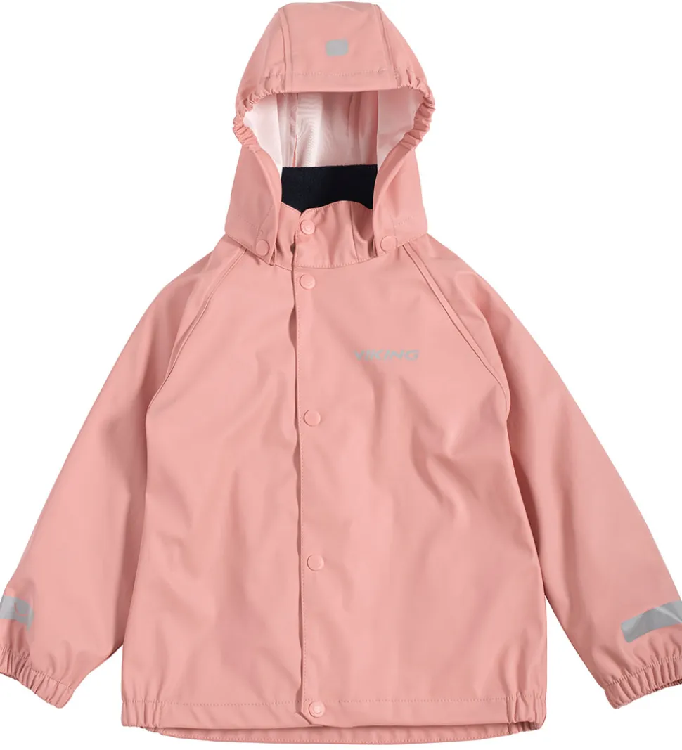 Lækkert Viking regntøj bestående af en regnjakke og et par regnbukser med seler i ensfarvet, rosa PU med reflekslogo og mange refleksdetaljer.
