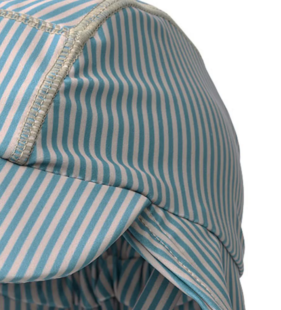 Stilfuld Wheat badehat i et elegant, stribet mønster med lyseblå og hvide nuancer, der skaber et klassisk look.
