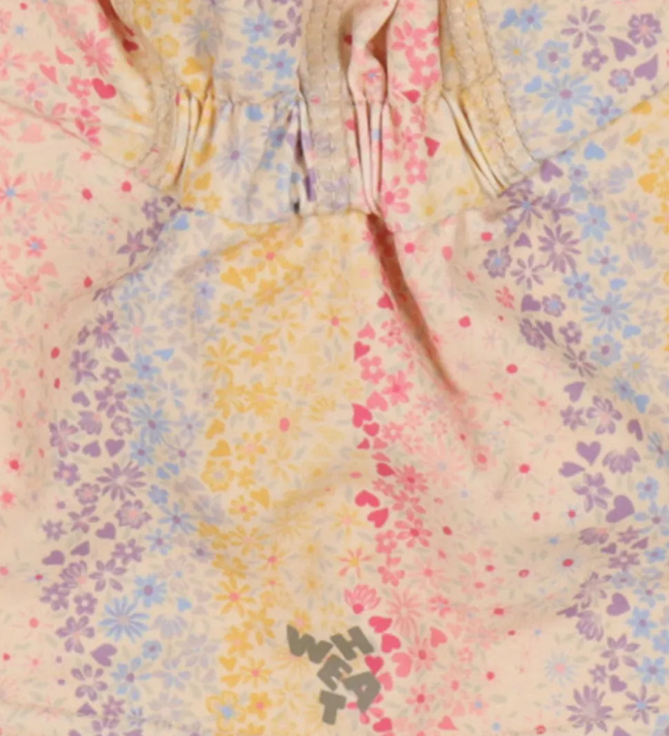 Fantastisk Wheat badehat i en lys, beige nuance, dekoreret med et mønster af delikate blomster i lyserøde, gule og lilla farver.