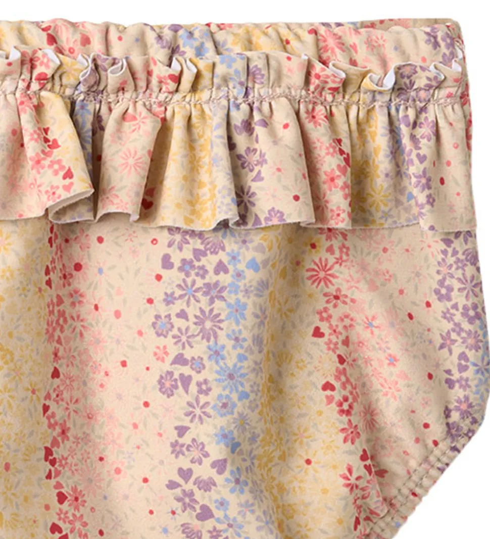 Smukke Wheat blebadebukser i en lys, beige nuance dekoreret med et fint blomstermønster i pastelfarver som lilla, rosa og gul. Designet udstråler en naturlig elegance med sit harmoniske brug af farver og mønstre.