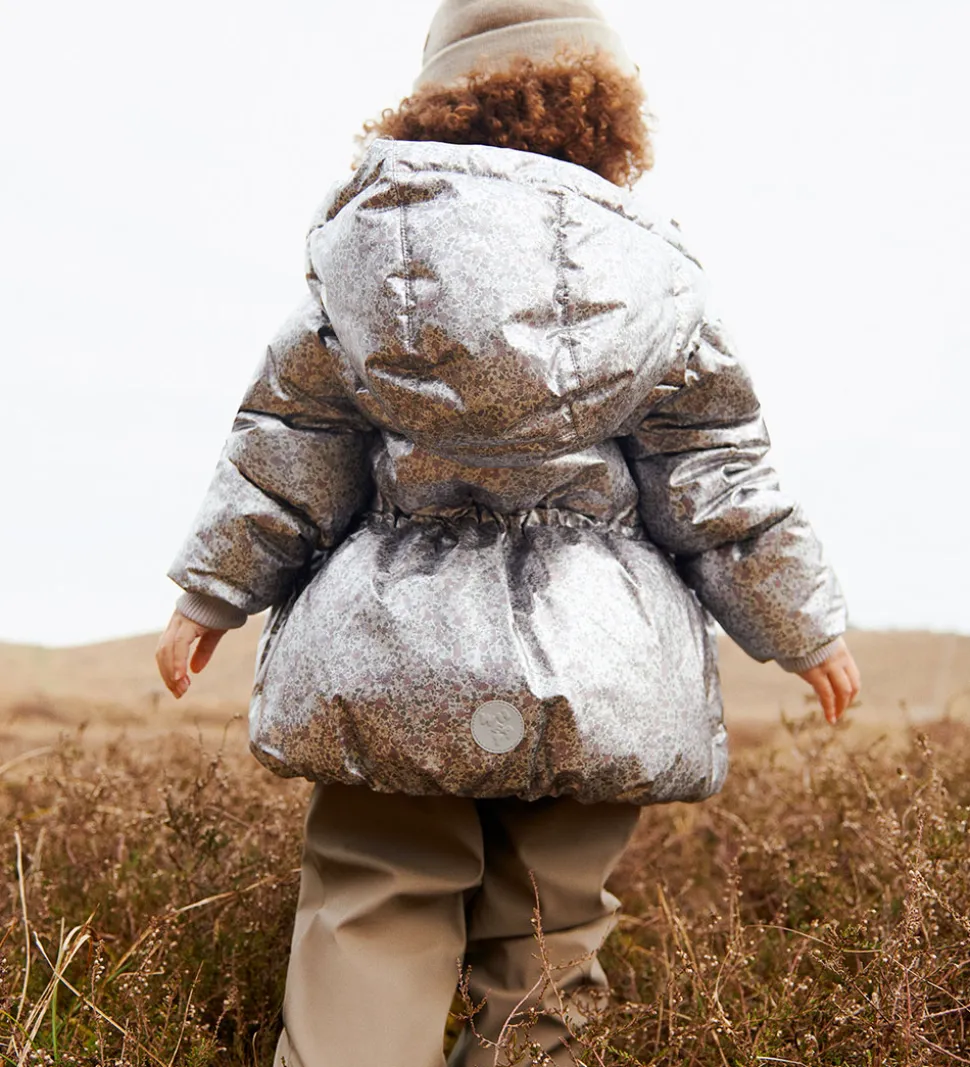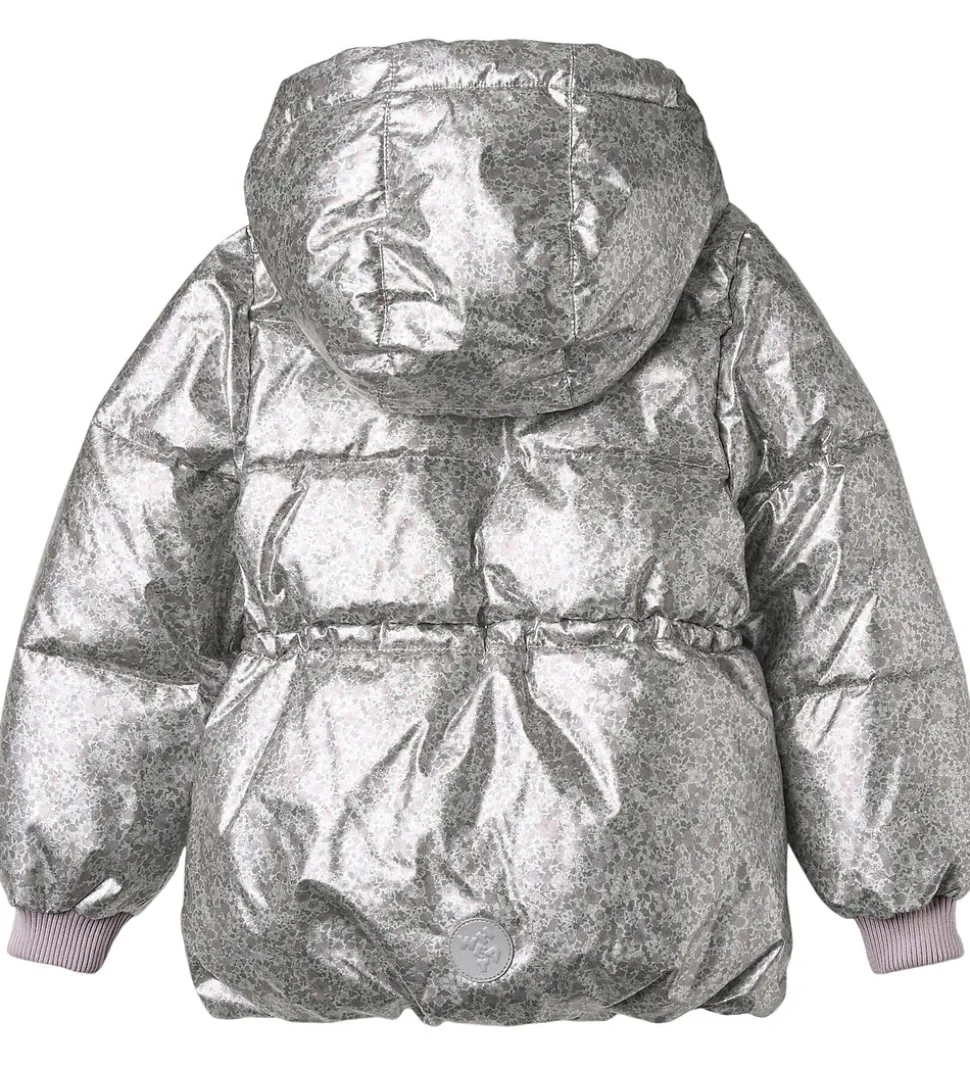 Lækker Wheat dynejakke i en skinnende sølvfarve med et alloverblomsterprint i støvet lilla, rosa og grønne farver. Dynejakken har vandrette syninger.