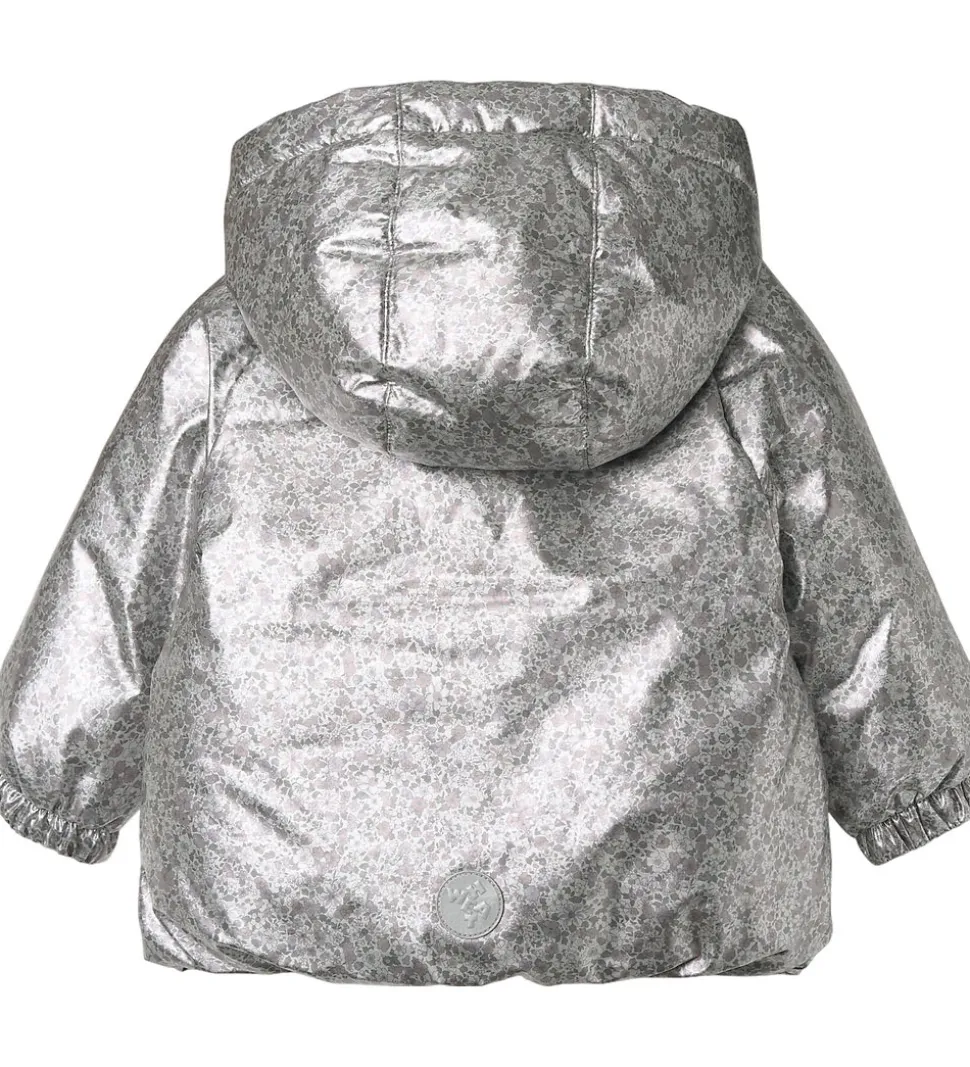 Lækker Wheat dynejakke i en skinnende sølvfarve med et alloverblomsterprint i støvet lilla, rosa og grønne farver.